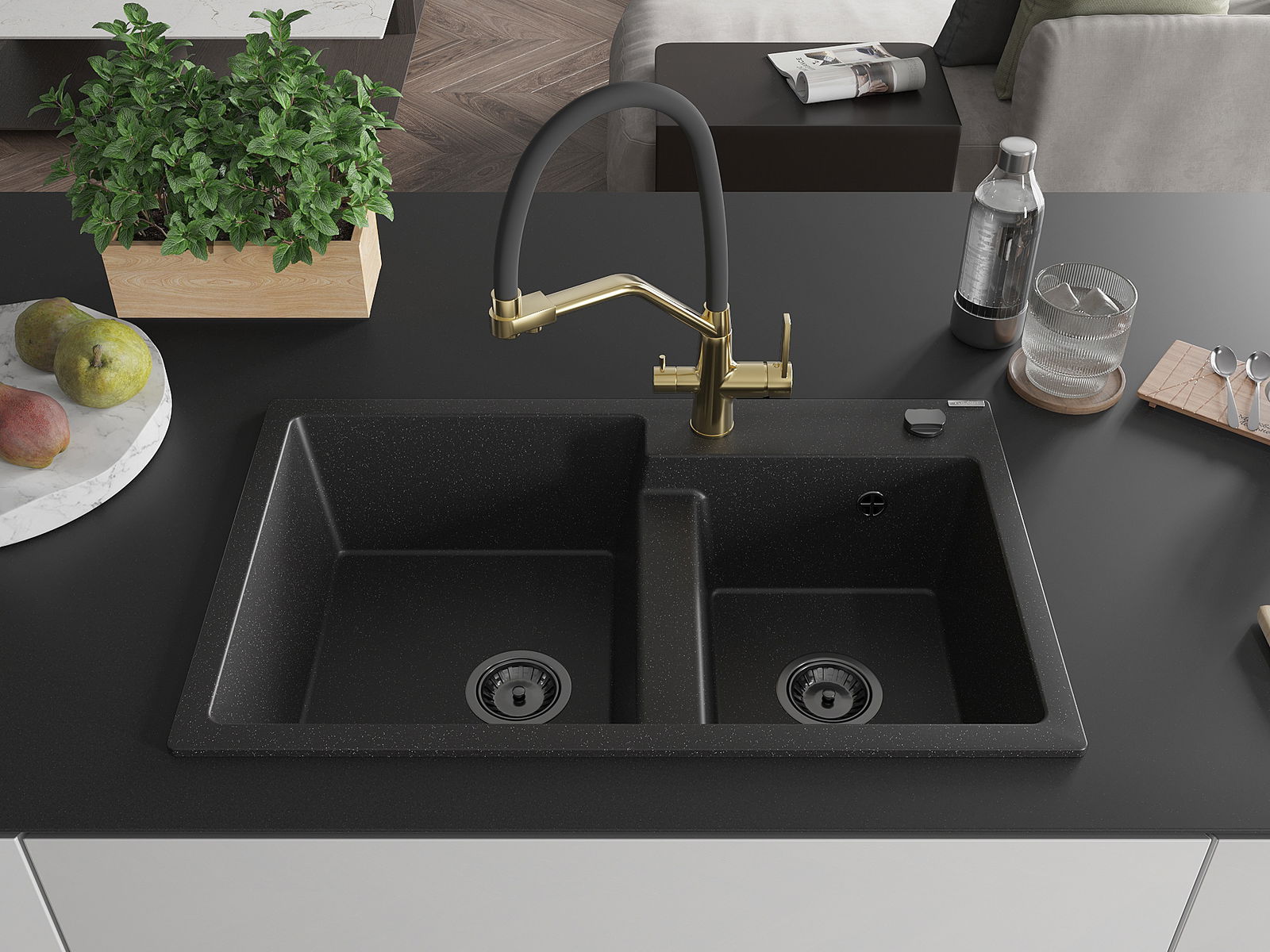 Das Spülbecken verfügt über eine vorgefräste Öffnung mit einem Durchmesser von 35 mm, die selbstständig durchbrochen werden kann. Sie kann unter anderem zur Montage eines Flüssigkeitsdosierers verwendet werden, der das Vorhandensein von Plastikflaschen in der Küche eliminiert und ihr ein elegantes Finish verleiht.