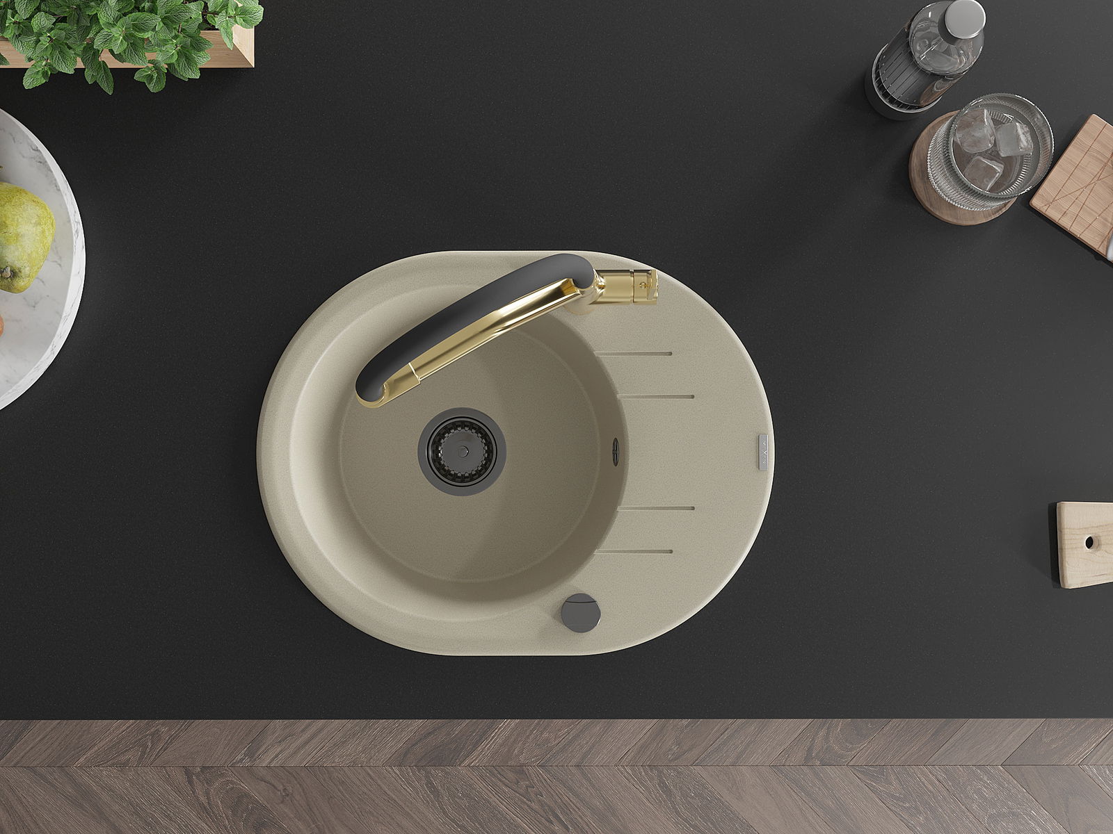 Die Spüle besteht aus hochwertigem Granit. Es ist eine elegante und vor allem praktische Ergänzung zu jeder Küche, unabhängig von ihrem Stil. Hohe Qualität und Granitdauer sorgen für eine langjährige Nutzung.