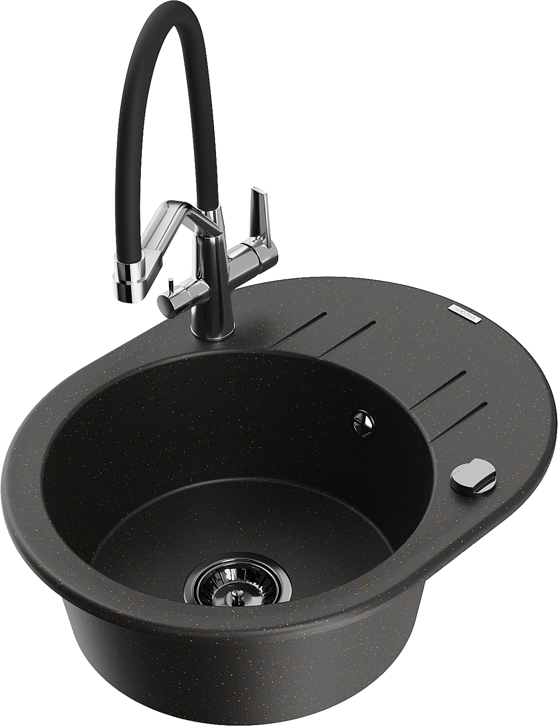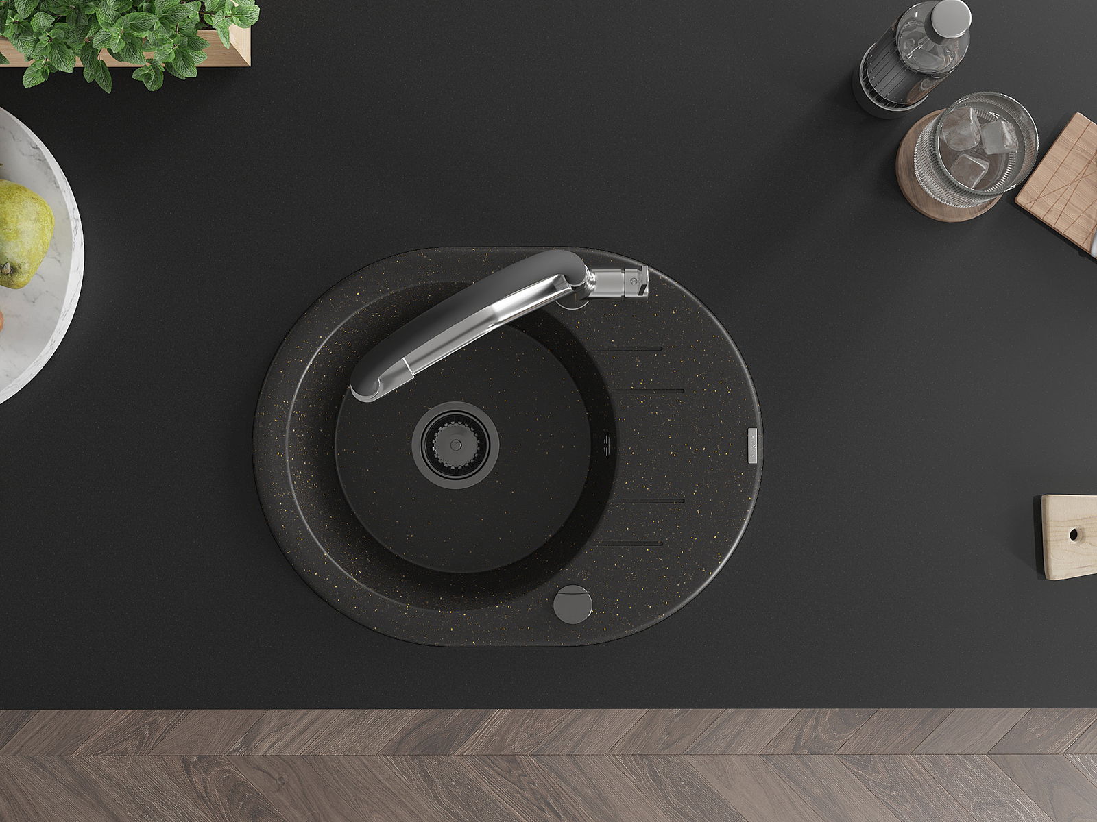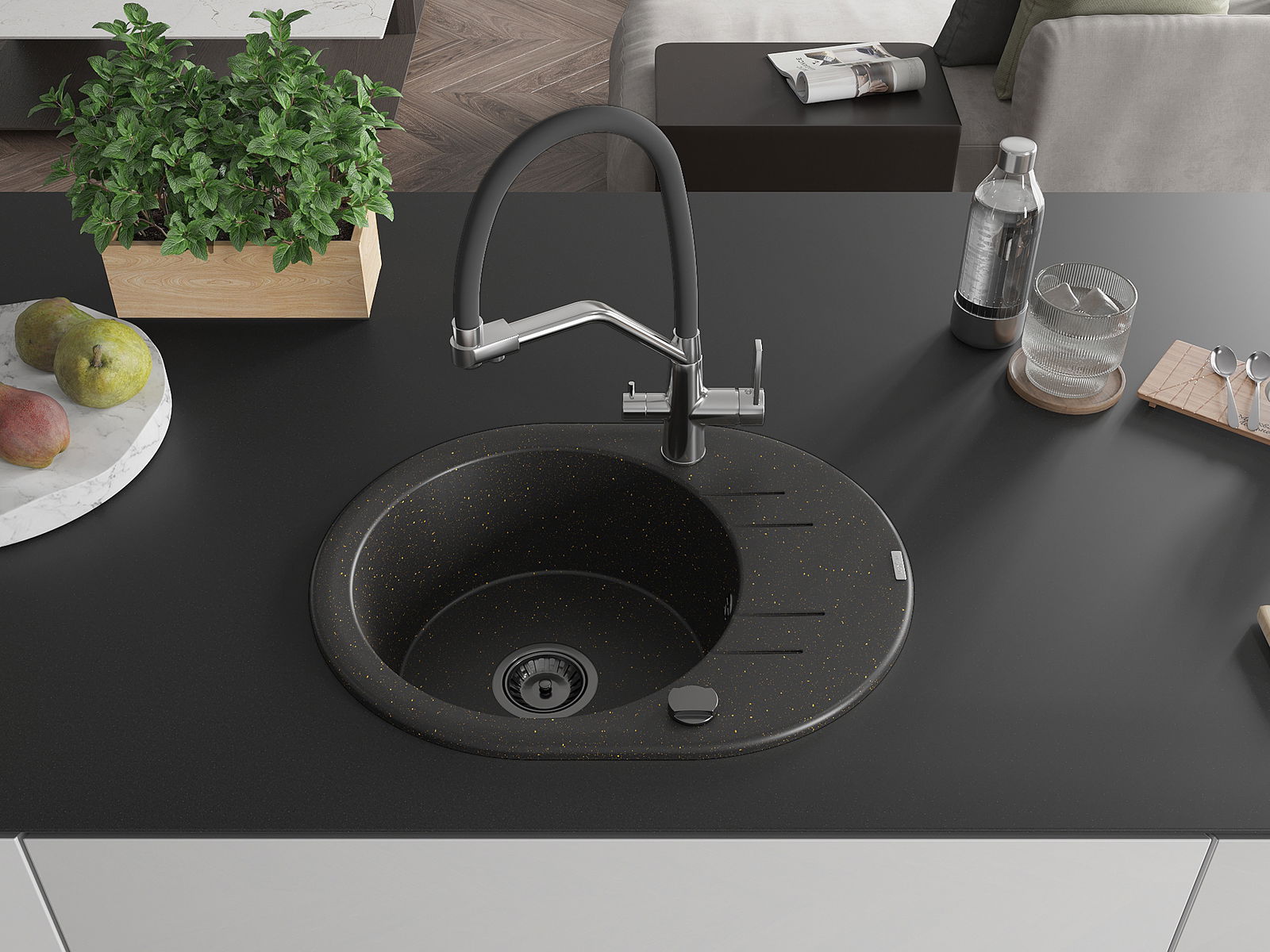 Die Spüle besteht aus hochwertigem Granit. Es ist eine elegante und vor allem praktische Ergänzung zu jeder Küche, unabhängig von ihrem Stil. Hohe Qualität und Granitdauer sorgen für eine langjährige Nutzung.