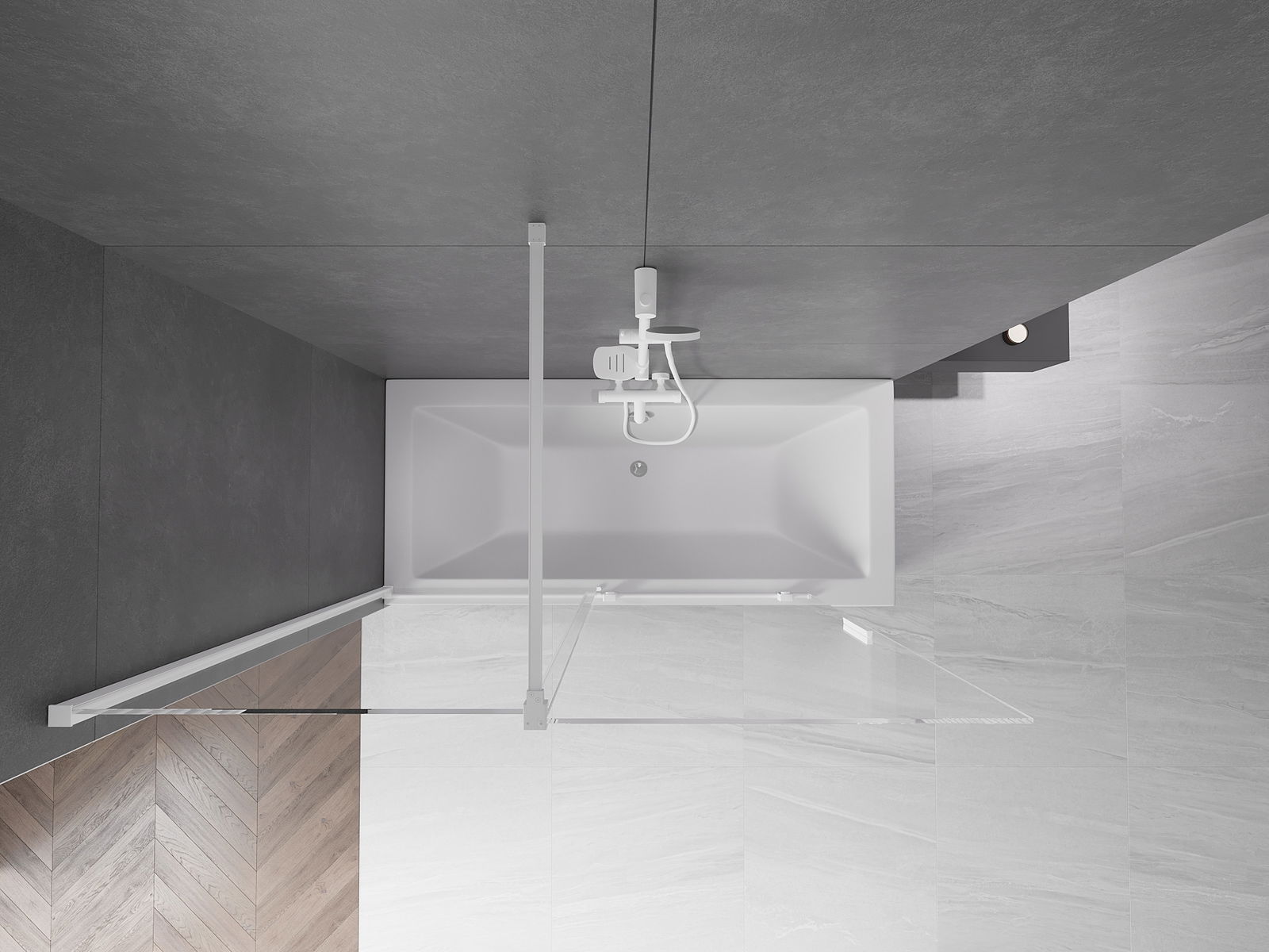 Effektiver Schutz gegen Wasser beim Baden. Der Bildschirm hat Dichtungen, die sich perfekt an das Glas des Glass und an der Badewanne der Badewanne anpassen. Eine funktionale Lösung, um Sicherheit und einfache Wartung zu gewährleisten.