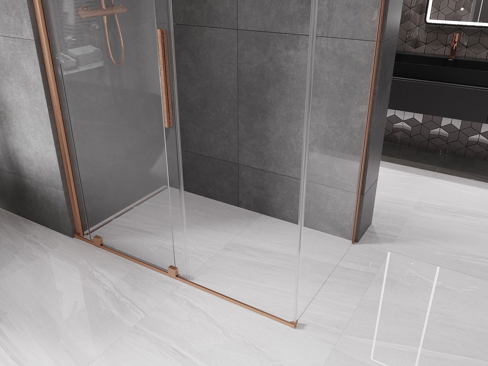 Der praktische und bequeme Griff ist aus rostfreiem Stahl gefertigt. Die modische Form, kombiniert mit einer auf die Farbe der Profile abgestimmten Oberfläche, verleiht dem Ganzen ein modernes und stilvolles Aussehen, das die Ästhetik eines jeden Badezimmers aufwertet.