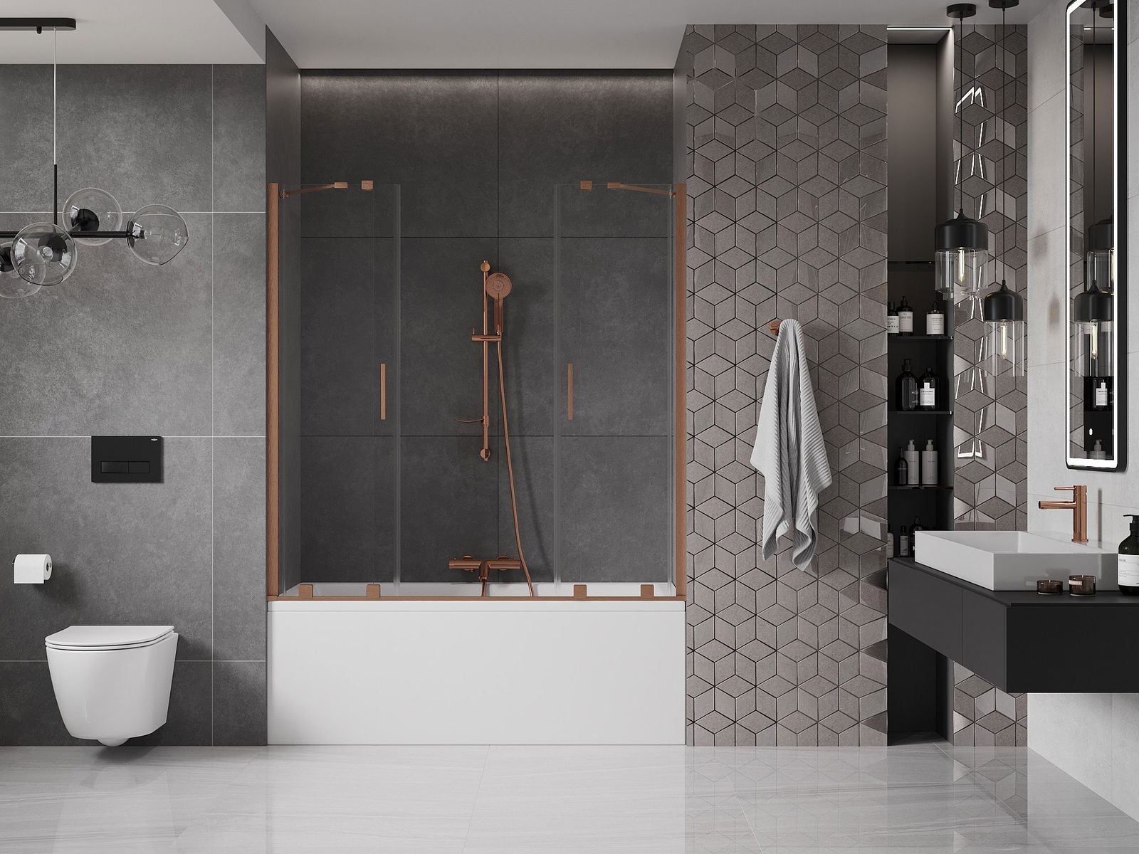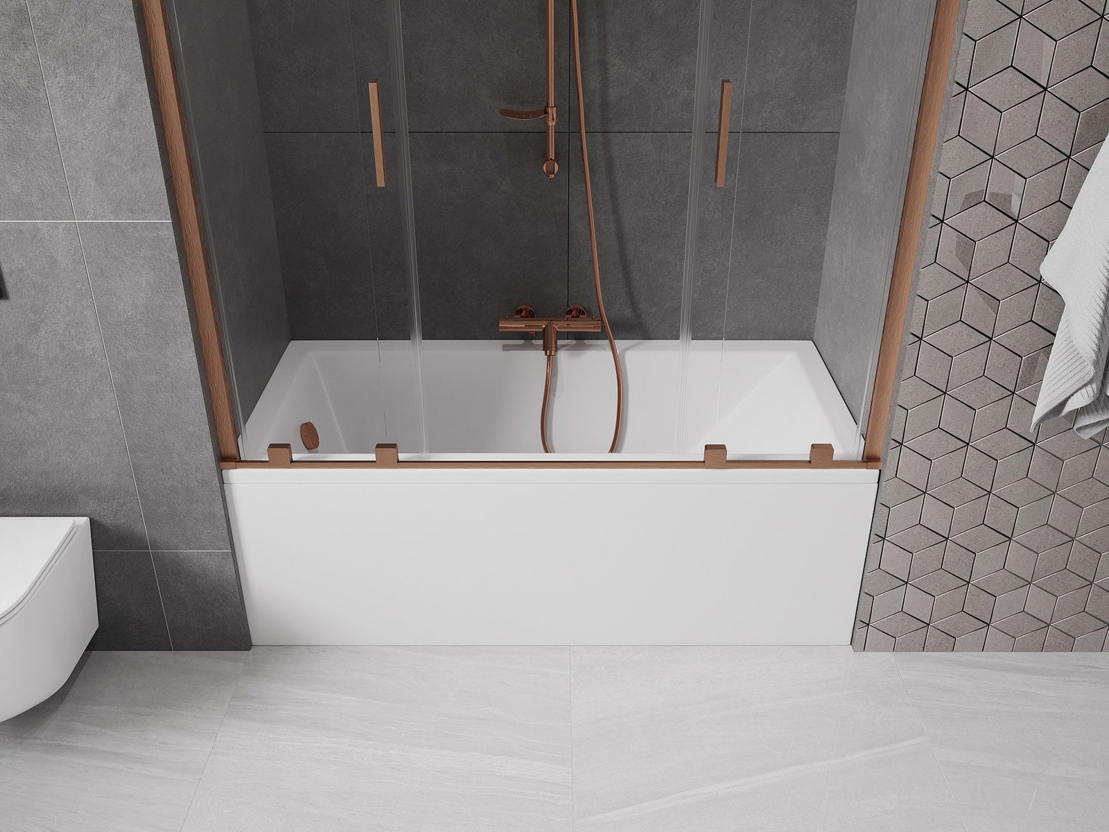 Effektiver Schutz gegen Wasser beim Baden. Der Bildschirm hat Dichtungen, die sich perfekt an das Glas des Glass und an der Badewanne der Badewanne anpassen. Eine funktionale Lösung, um Sicherheit und einfache Wartung zu gewährleisten.