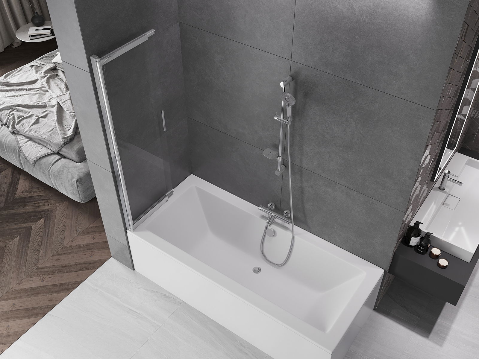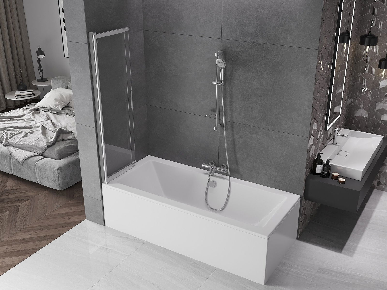Effektiver Schutz gegen Wasser beim Baden. Der Bildschirm hat Dichtungen, die sich perfekt an das Glas des Glass und an der Badewanne der Badewanne anpassen. Eine funktionale Lösung, um Sicherheit und einfache Wartung zu gewährleisten.