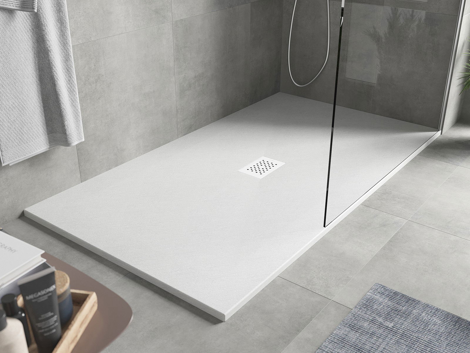 Die Oberfläche der Duschschale ähnelt einem Stein mit seiner Struktur. Es ist eine einzigartige Kombination aus natürlichen Aussehen mit einer modernen Innenanordnung. Es fügt Charakter hinzu, betont die Ästhetik und Eleganz des Badezimmerdekors und beeindruckt mit seiner Form.