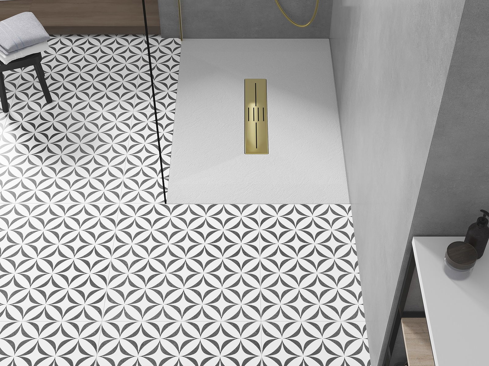 Die Duschschale hat einen niedrigen Schwellenwert, wodurch es einfacher ist, die Dusche zu betreten und zu verlassen. Es verleiht dem Raum ein einzigartiges und zeitloses Finish, wodurch das Badezimmer zu einem bequemen und ästhetischen Ort der täglichen Entspannung wird.