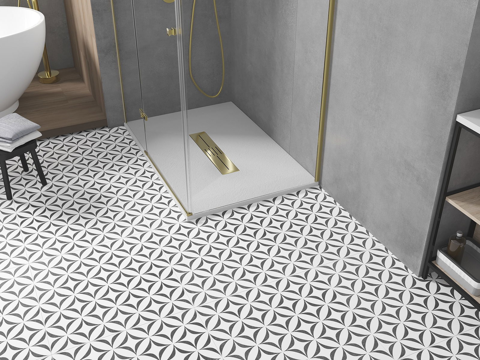 Die Duschschale hat einen niedrigen Schwellenwert, wodurch es einfacher ist, die Dusche zu betreten und zu verlassen. Es verleiht dem Raum ein einzigartiges und zeitloses Finish, wodurch das Badezimmer zu einem bequemen und ästhetischen Ort der täglichen Entspannung wird.