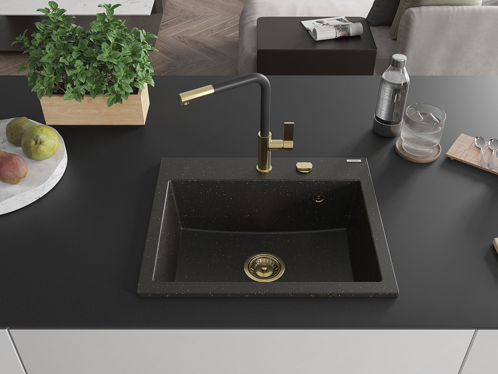 Die Spüle besteht aus hochwertigem Granit. Es ist eine elegante und vor allem praktische Ergänzung zu jeder Küche, unabhängig von ihrem Stil. Hohe Qualität und Granitdauer sorgen für eine langjährige Nutzung.