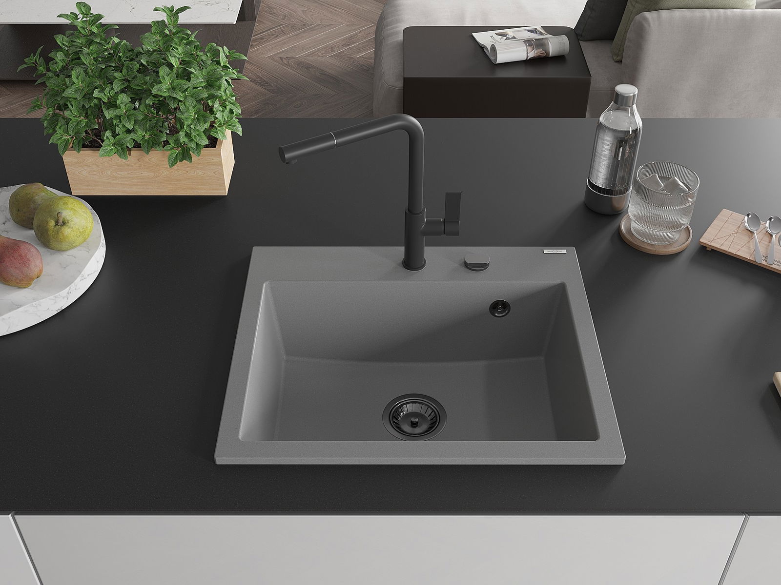 Die Spüle besteht aus hochwertigem Granit. Es ist eine elegante und vor allem praktische Ergänzung zu jeder Küche, unabhängig von ihrem Stil. Hohe Qualität und Granitdauer sorgen für eine langjährige Nutzung.