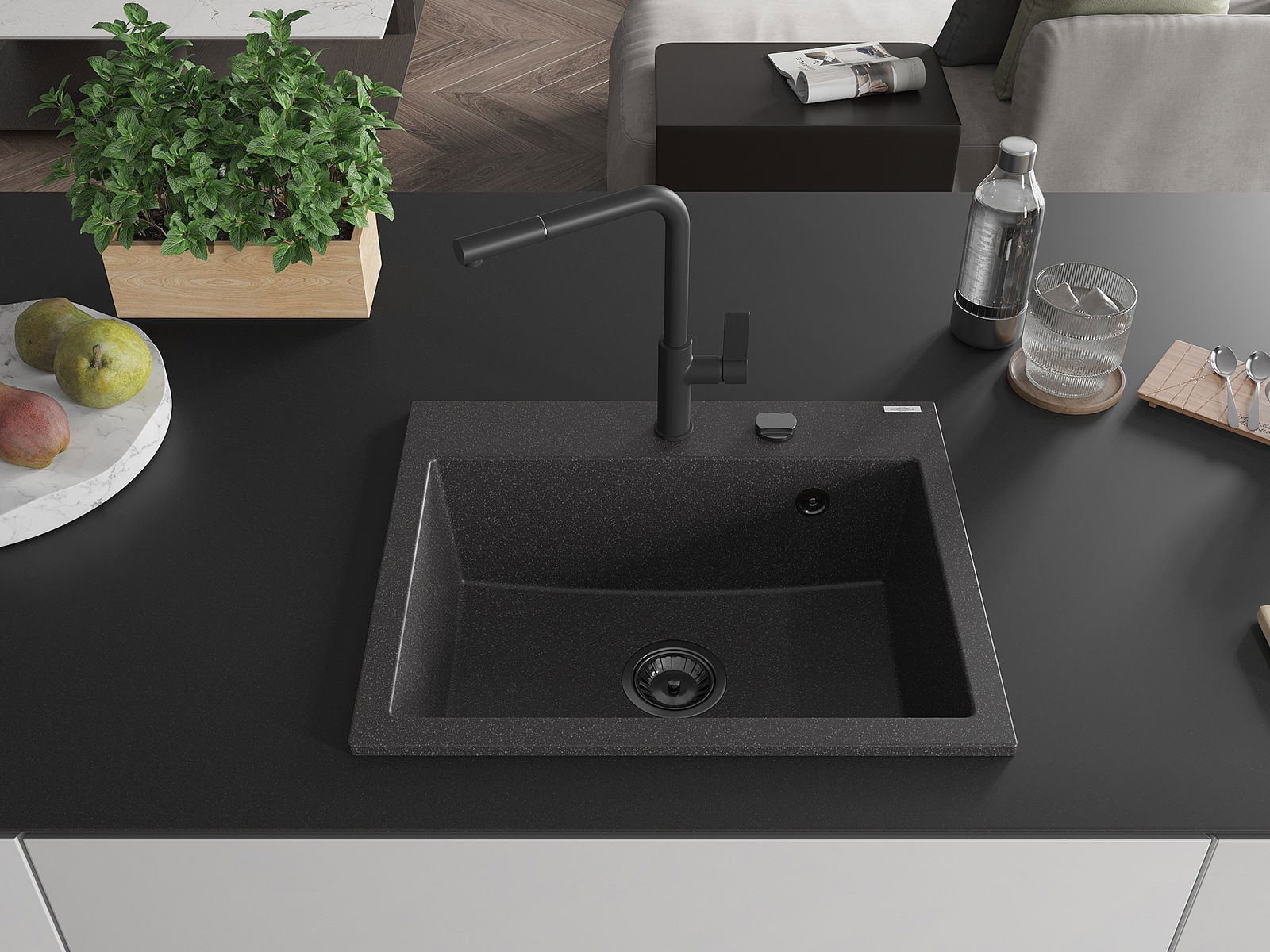 Die Spüle besteht aus hochwertigem Granit. Es ist eine elegante und vor allem praktische Ergänzung zu jeder Küche, unabhängig von ihrem Stil. Hohe Qualität und Granitdauer sorgen für eine langjährige Nutzung.