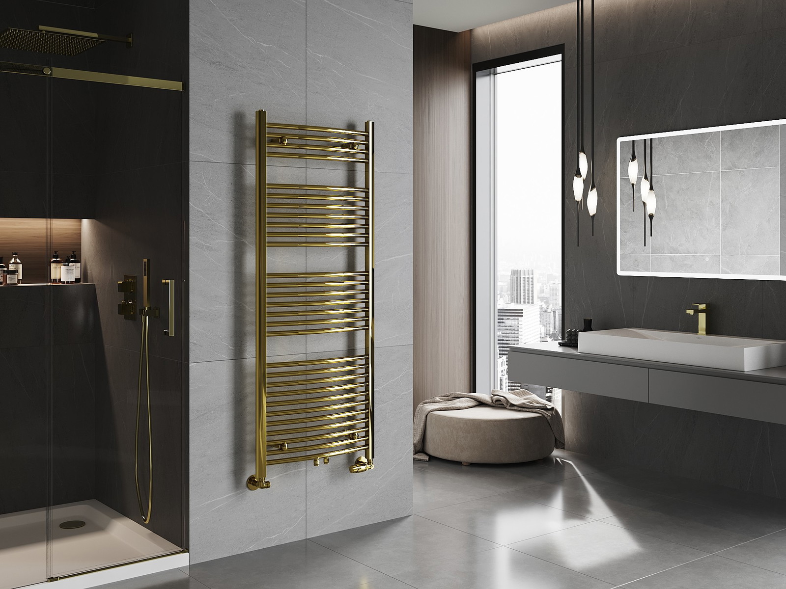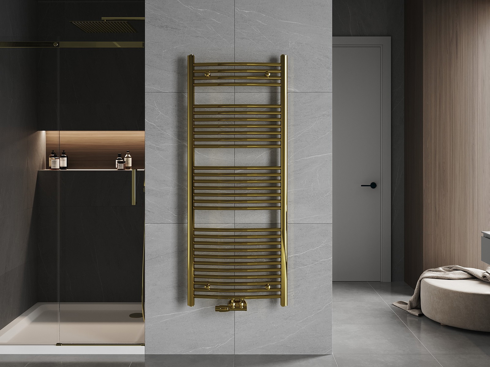 Mexen Ares ist ein eleganter Badezimmerheizkörper mit den Maßen 1500 x 600 mm, der Funktionalität mit modernem Design perfekt verbindet. Mit einer Leistung von 579 W heizt er jedes Badezimmer schnell auf, und die goldene Farbe verleiht dem Raum einen luxuriösen Charakter. Der Heizkörper besteht aus Stahl, was seine Langlebigkeit garantiert, und die korrosionsbeständige Beschichtung sorgt für eine lange Lebensdauer. Die durchdachte Konstruktion ermöglicht verschiedene Anschluss- und Montageoptionen des Heizelements, was die Installation erheblich erleichtert.