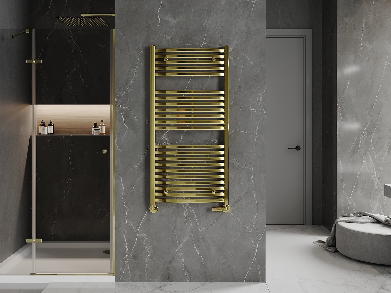 Der Mexen Helios Badezimmerheizkörper ist eine ausgezeichnete Wahl für ein elegantes Badezimmer. Dank seines goldenen Finishs wird er zu einem besonderen Designelement. Die Höhe von 1200 mm und die Breite von 600 mm sorgen für optimale Heizung und die Leistung von 521 W garantiert Effizienz. Aus Stahl gefertigt, ist er dank der langlebigen Lackierung korrosionsbeständig. Die Möglichkeit der Installation eines Heizstabs erhöht die Funktionalität. Er bietet Sicherheit mit einer Brandreaktion von A1 und hält Temperaturen bis zu 95 °C stand.