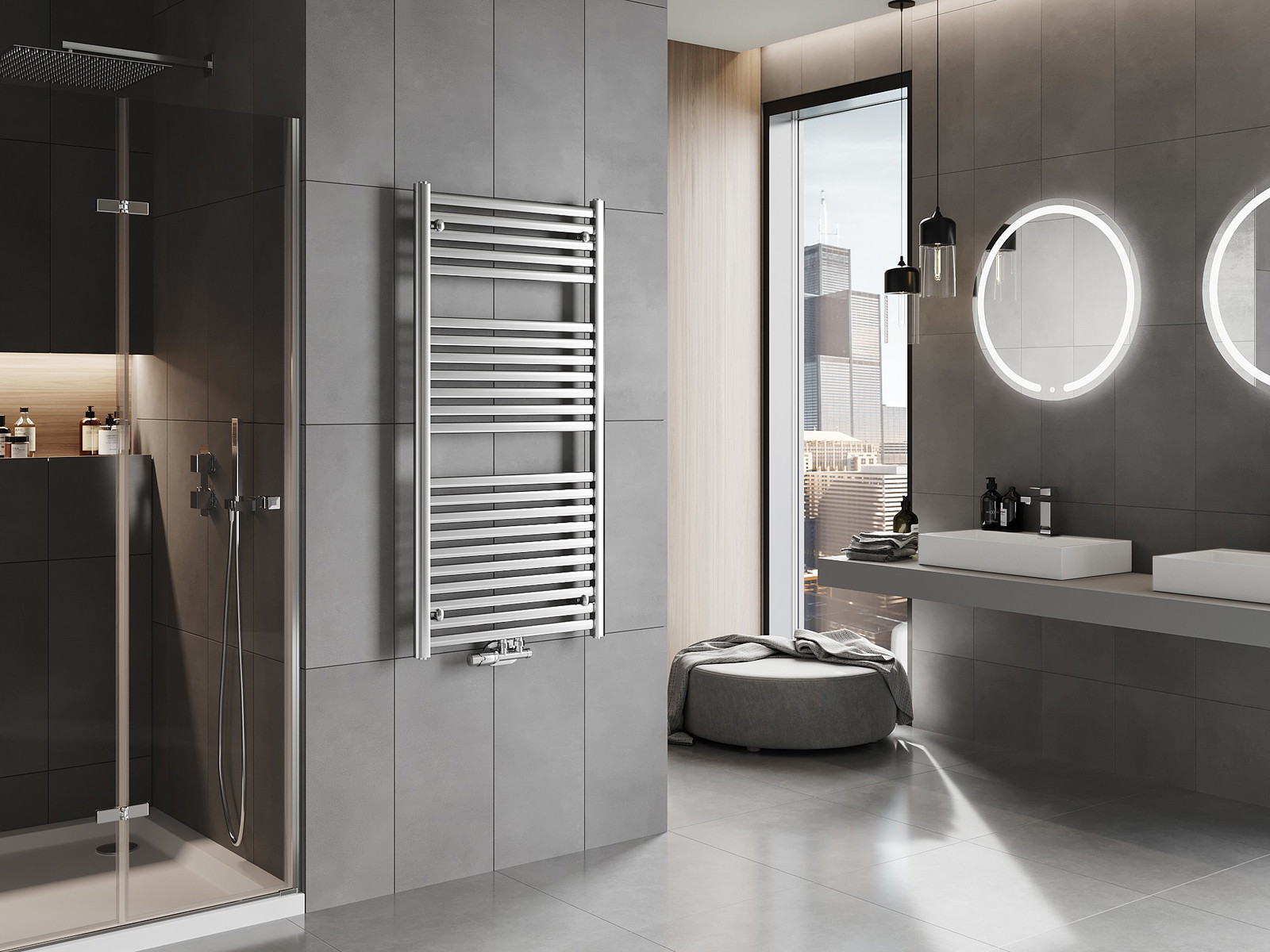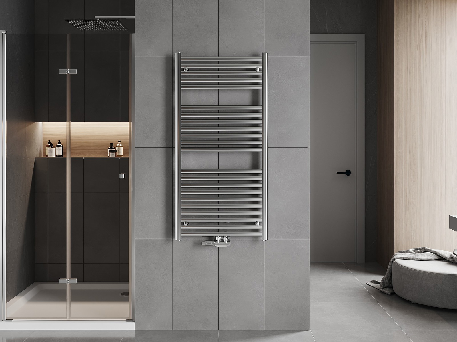 Der Mexen Hades Badezimmerheizkörper mit den Abmessungen 1200 x 600 mm kombiniert modernes Design mit hoher Effizienz. Aus verchromtem Stahl gefertigt, bietet er eine Heizleistung von 527 W bei einer Temperatur von 75/65/20 °C und eine maximale Betriebstemperatur von bis zu 95 °C. Das Produkt ist mit verschiedenen Anschlüssen ausgestattet, die einen flexiblen Anschluss ermöglichen, sowie mit einer hochwertigen, korrosionsbeständigen Beschichtung. Im Set sind Aufhängungen, Montageset, Verschlussstopfen und Entlüfter enthalten.