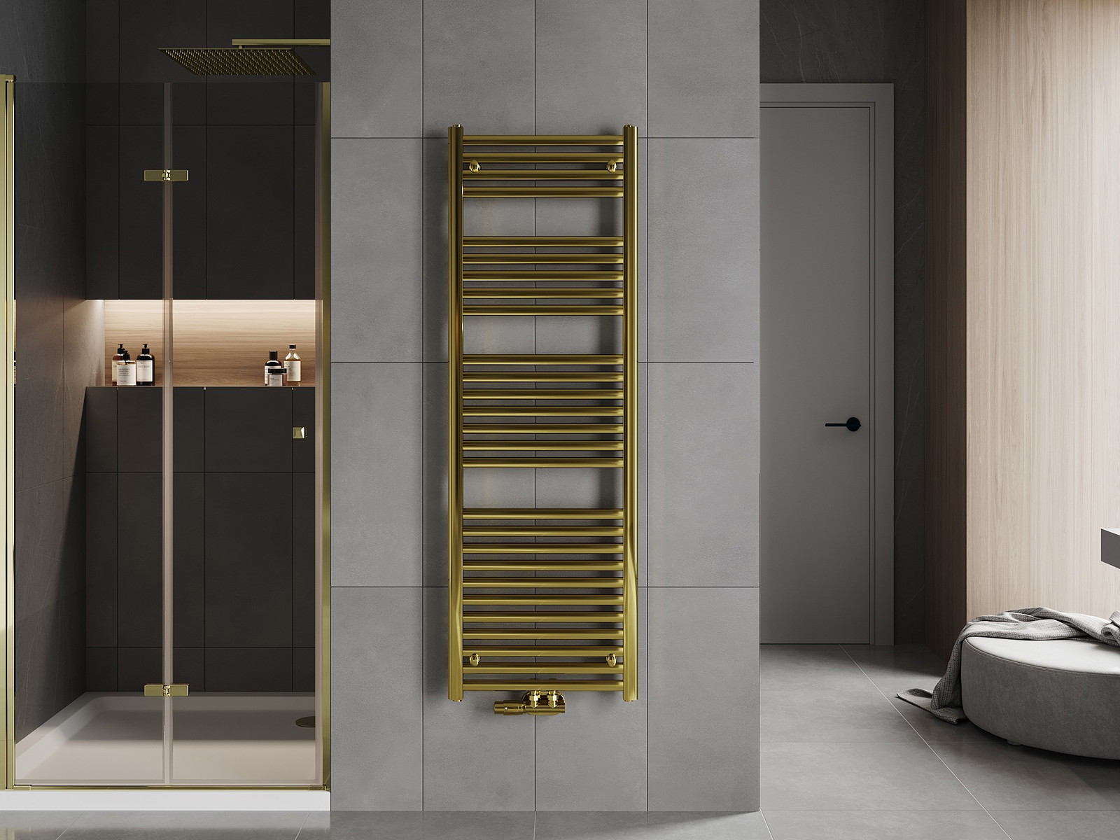 Mexen Hades ist ein eleganter goldener Badezimmerheizkörper mit den Maßen 1500x500 mm, der nicht nur stilvolles Aussehen, sondern auch Effizienz dank seiner 555 W Leistung bietet. Hergestellt aus hochwertigem Stahl, korrosionsbeständig dank der langlebigen Lackierung. Dank verschiedener Anschlussabstände (unten 45 cm, mittig 5 cm) und der Möglichkeit zur Montage eines Heizstabs ist er äußerst funktional. Seine leichte Konstruktion (11,39 kg) und Beständigkeit gegen hohe Temperaturen (max. 95 °C) sowie Druck (0,6 Mpa) machen ihn zu einer zuverlässigen Wahl für jedes Badezimmer.