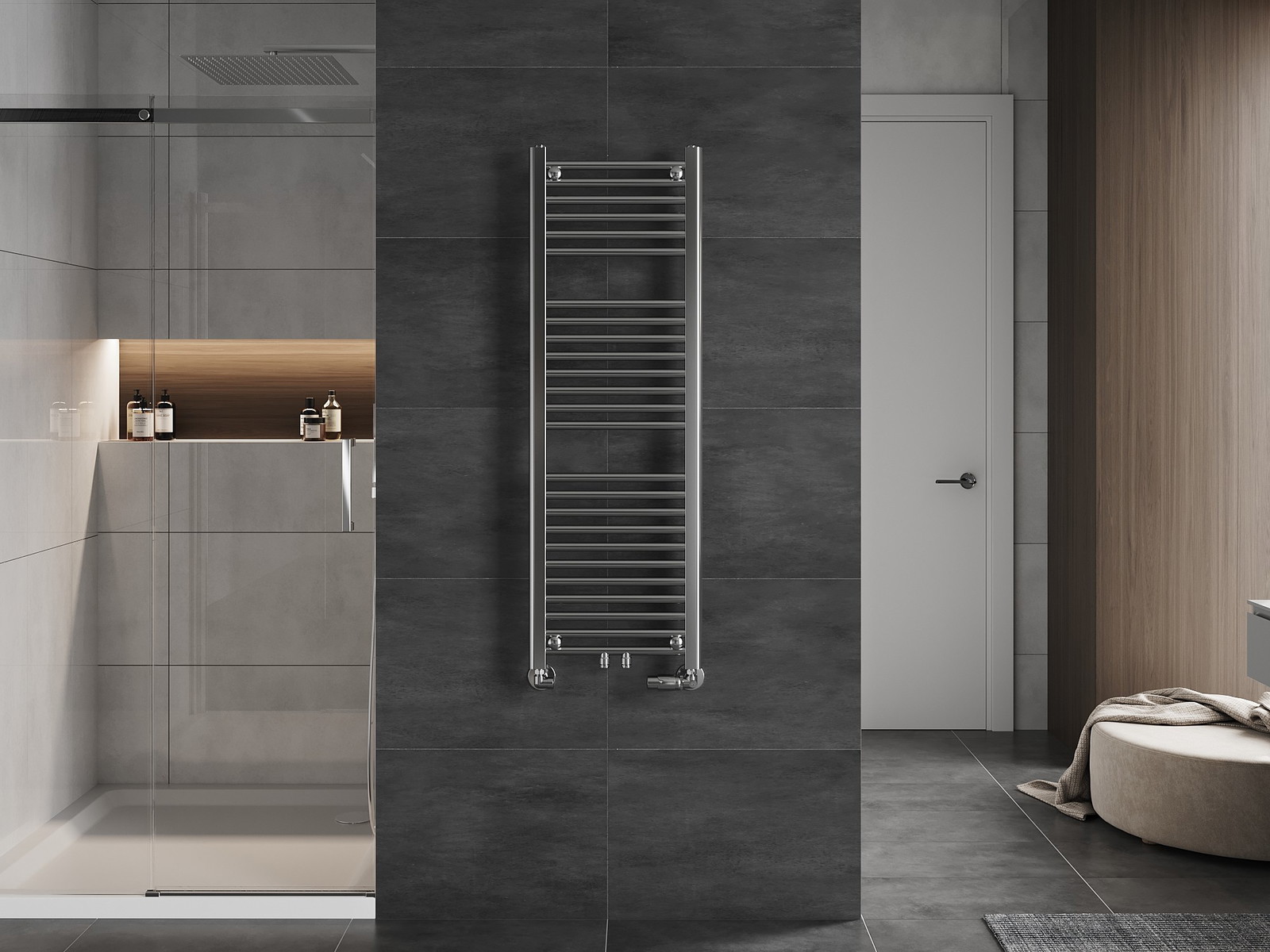 Mexen Mars ist ein moderner Badheizkörper mit den Maßen 1200 x 400 mm, der sich perfekt für jedes Badezimmer eignet. Er zeichnet sich durch eine Leistung von 346 W aus, was eine effektive Raumerwärmung gewährleistet. Sein Chromfinish verleiht dem Innenraum Eleganz, und die Ausführung aus Stahl garantiert Langlebigkeit und Korrosionsbeständigkeit. Der Heizkörper bietet die Möglichkeit zur Montage eines Heizelements, und die maximale Arbeitstemperatur beträgt 95°C. Das Set enthält Halterungen und ein Montageset, was die Installation erleichtert.