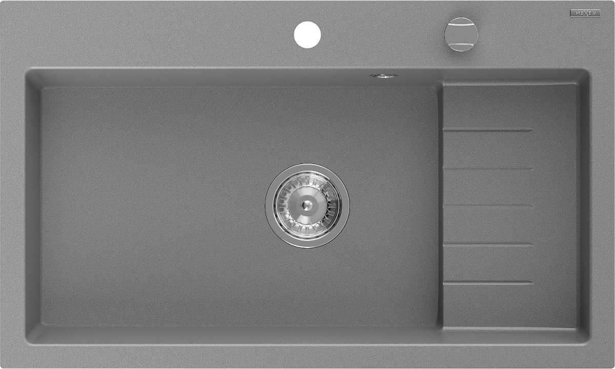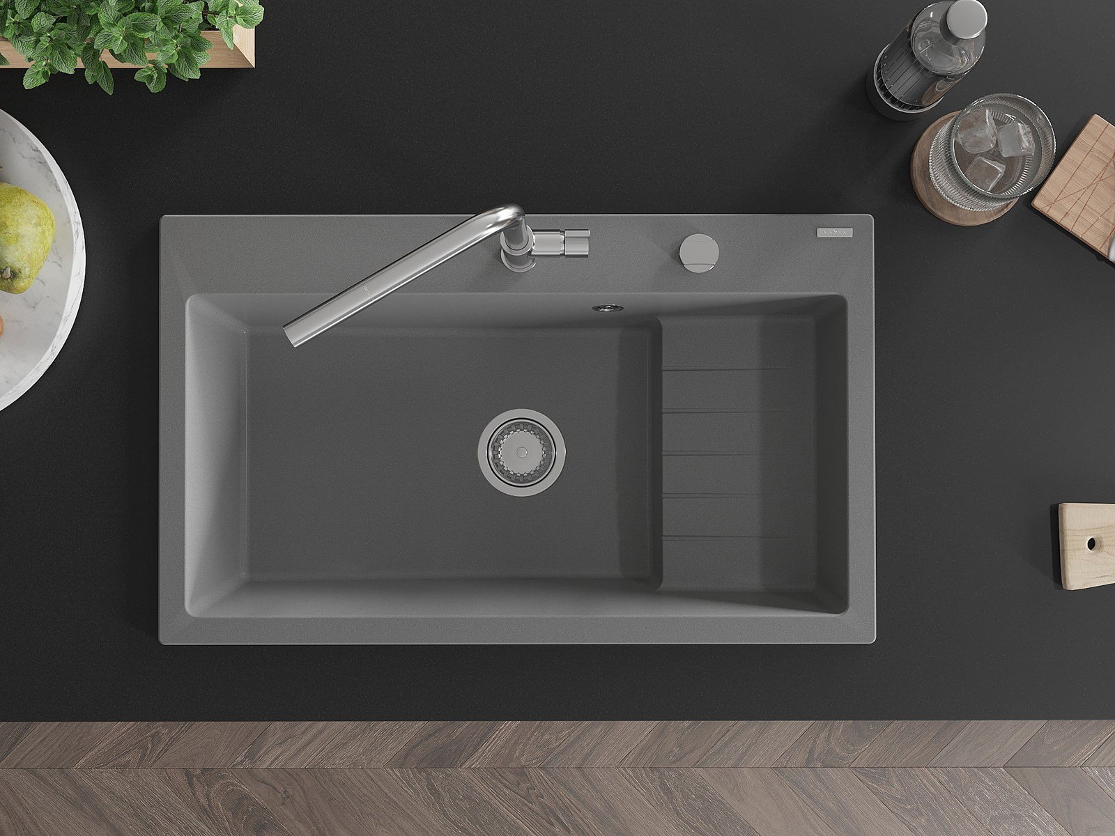 Die Spüle besteht aus hochwertigem Granit. Es ist eine elegante und vor allem praktische Ergänzung zu jeder Küche, unabhängig von ihrem Stil. Hohe Qualität und Granitdauer sorgen für eine langjährige Nutzung.