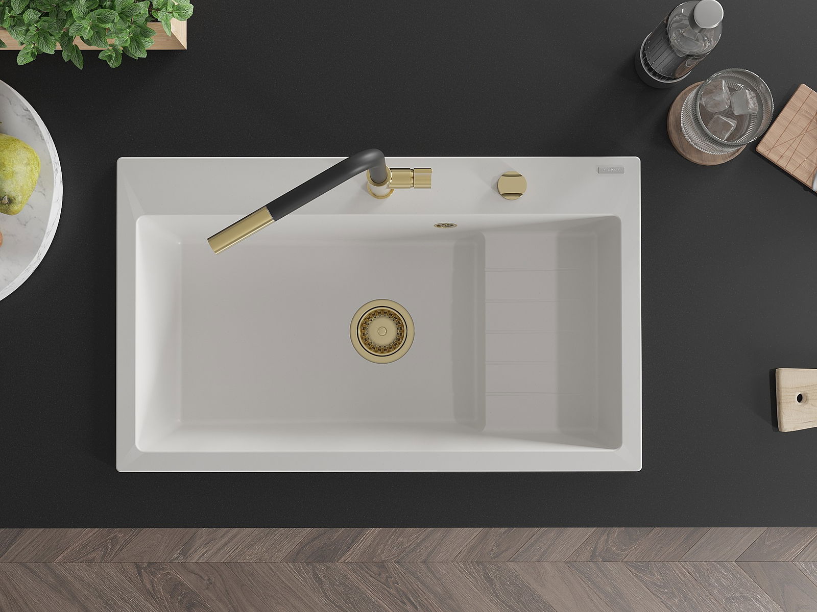 Die Oberfläche des Spülbeckens ist sehr gut gehärtet und zeichnet sich durch außergewöhnliche Widerstandsfähigkeit gegen mechanische Beschädigungen und Kratzer aus. Das langlebige Material ermöglicht es, viele Jahre lang das gute Aussehen des Spülbeckens zu genießen.