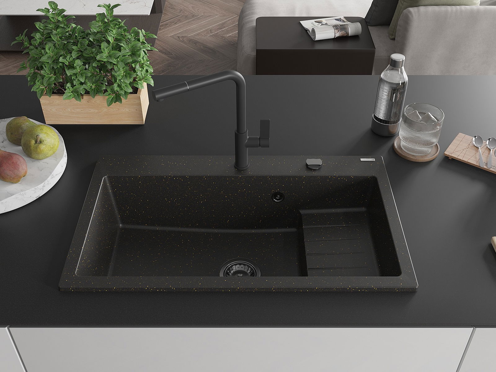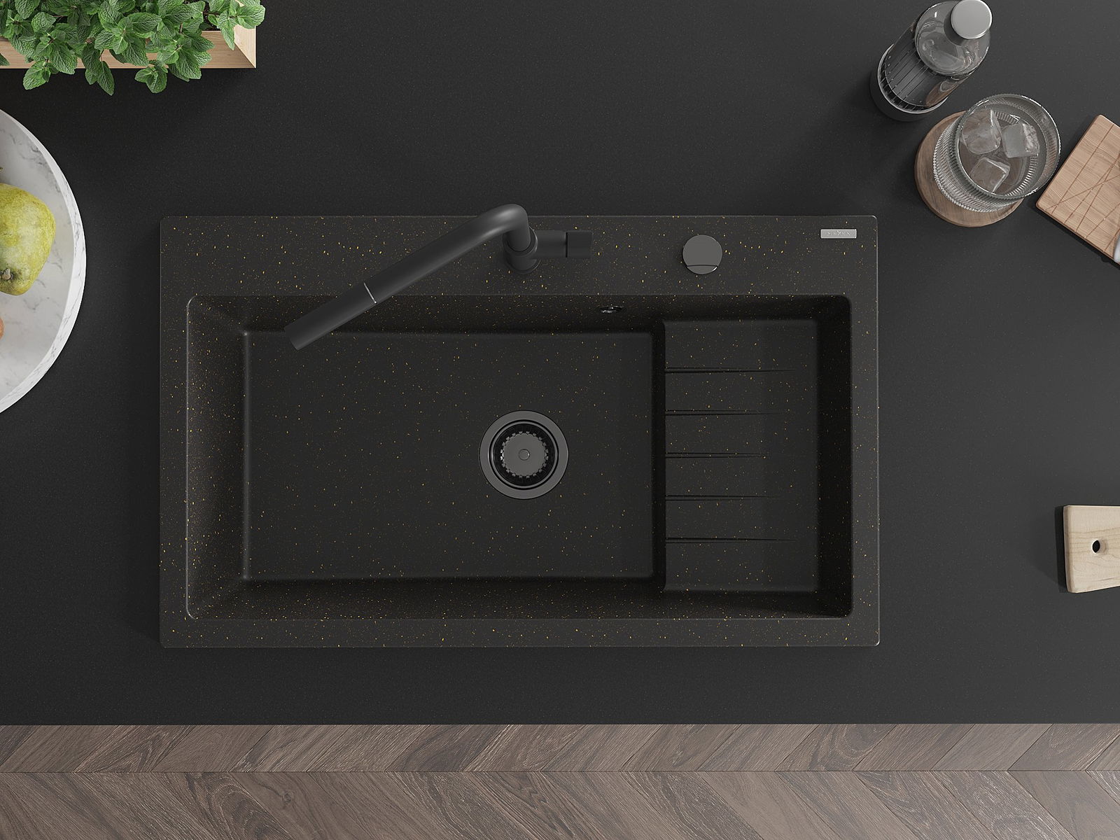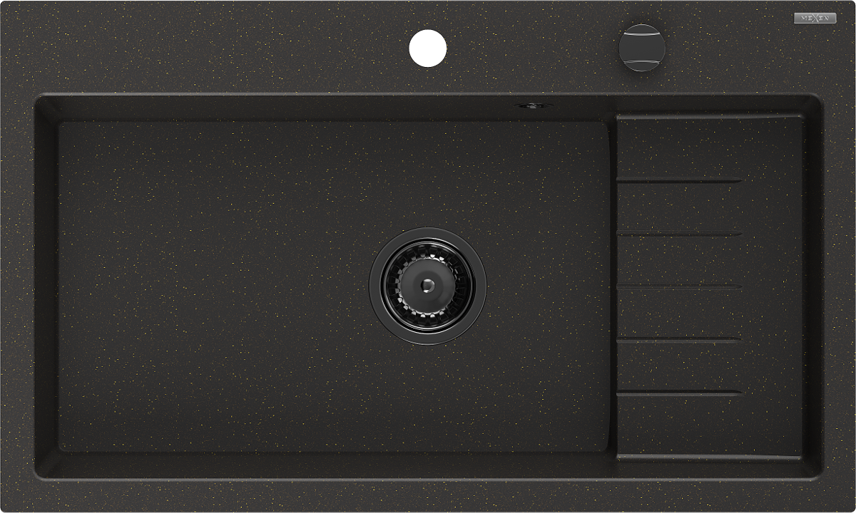 Die Spüle besteht aus hochwertigem Granit. Es ist eine elegante und vor allem praktische Ergänzung zu jeder Küche, unabhängig von ihrem Stil. Hohe Qualität und Granitdauer sorgen für eine langjährige Nutzung.