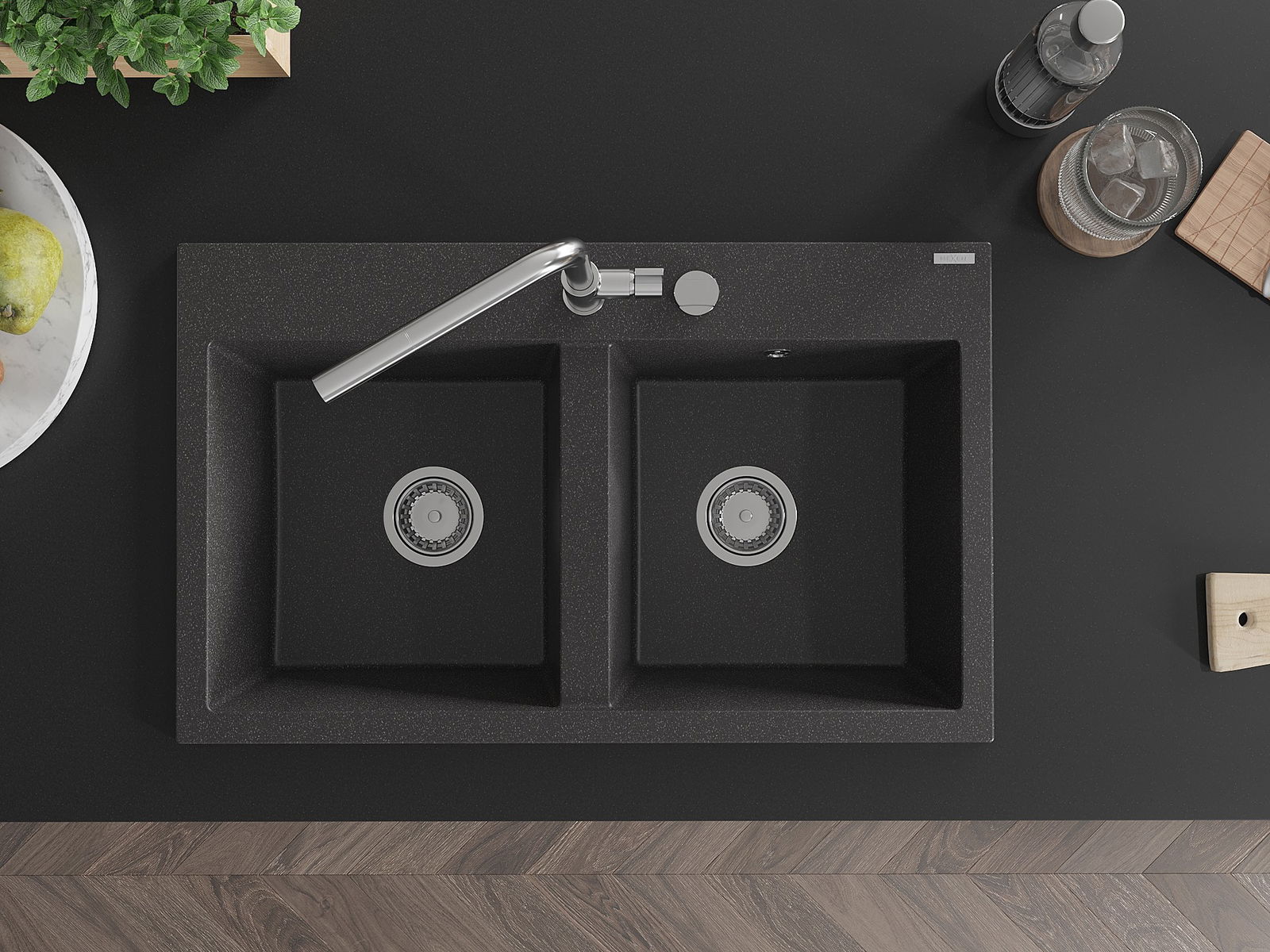 Das Spülbecken verfügt über eine vorgefräste Öffnung mit einem Durchmesser von 35 mm, die selbstständig durchbrochen werden kann. Sie kann unter anderem zur Montage eines Flüssigkeitsdosierers verwendet werden, der das Vorhandensein von Plastikflaschen in der Küche eliminiert und ihr ein elegantes Finish verleiht.