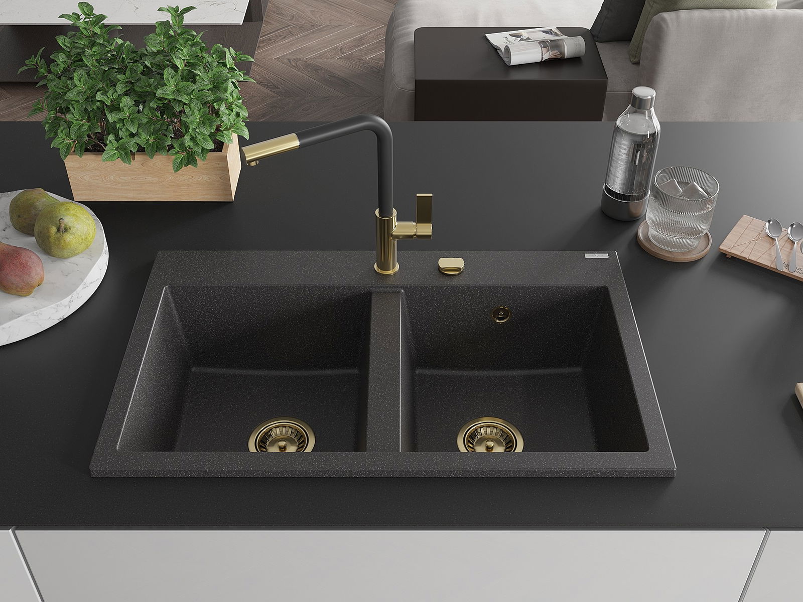 Das Spülbecken verfügt über eine vorgefräste Öffnung mit einem Durchmesser von 35 mm, die selbstständig durchbrochen werden kann. Sie kann unter anderem zur Montage eines Flüssigkeitsdosierers verwendet werden, der das Vorhandensein von Plastikflaschen in der Küche eliminiert und ihr ein elegantes Finish verleiht.