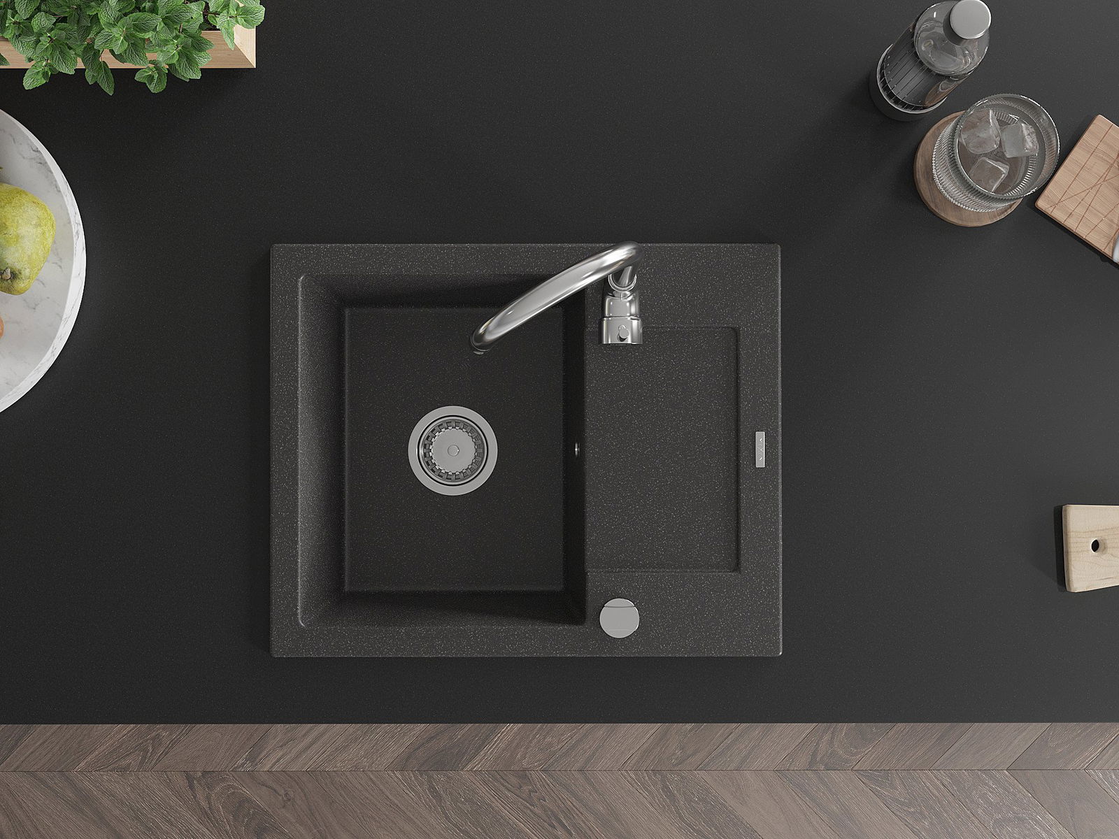 Die Spüle besteht aus hochwertigem Granit. Es ist eine elegante und vor allem praktische Ergänzung zu jeder Küche, unabhängig von ihrem Stil. Hohe Qualität und Granitdauer sorgen für eine langjährige Nutzung.