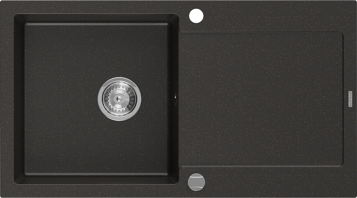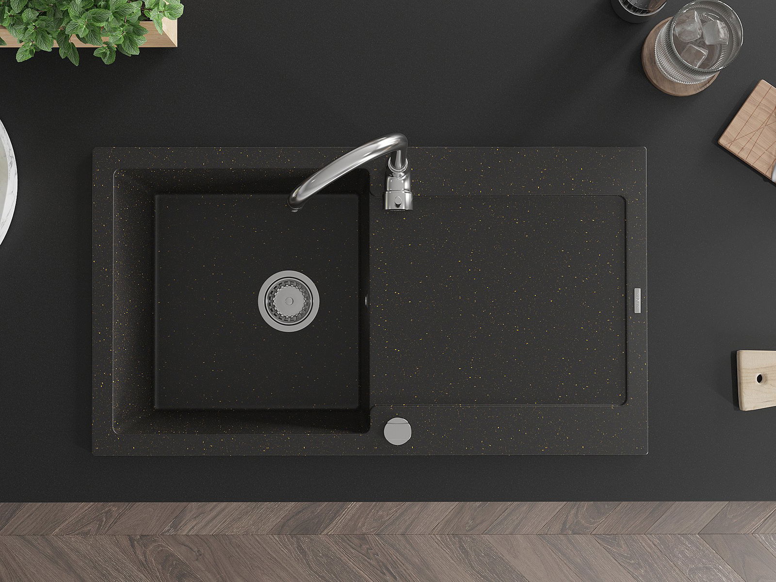 Die Spüle besteht aus hochwertigem Granit. Es ist eine elegante und vor allem praktische Ergänzung zu jeder Küche, unabhängig von ihrem Stil. Hohe Qualität und Granitdauer sorgen für eine langjährige Nutzung.