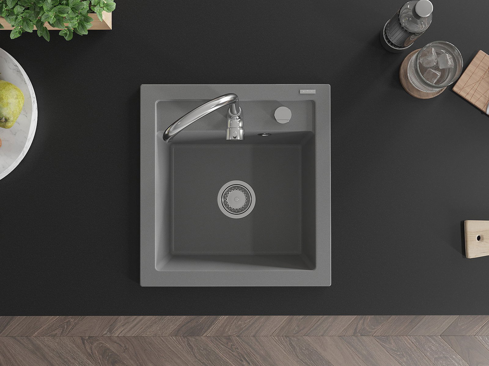 Die Spüle besteht aus hochwertigem Granit. Es ist eine elegante und vor allem praktische Ergänzung zu jeder Küche, unabhängig von ihrem Stil. Hohe Qualität und Granitdauer sorgen für eine langjährige Nutzung.