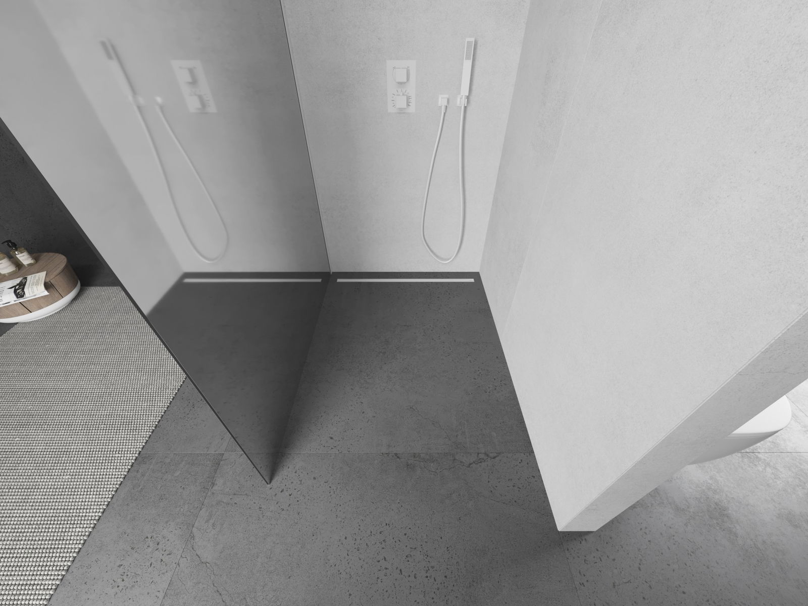 Die begehbare Duschwand ist eine ideale Lösung für Menschen mit Behinderungen. Die offene Kabine bietet einfachen Zugang und beseitigt die Notwendigkeit, Schwellenwerte und Türen zu überwinden. Die Dusche ist komfortabel und freundlich für alle.