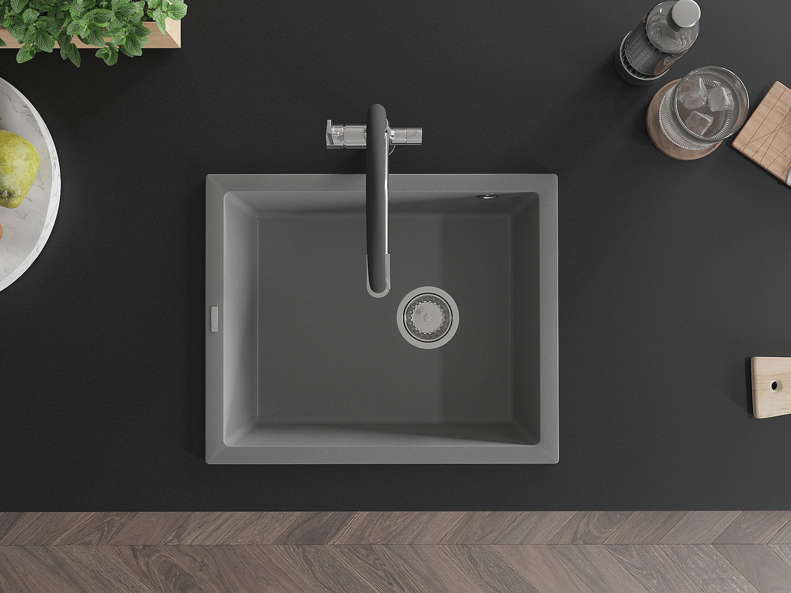 Die Spüle besteht aus hochwertigem Granit. Es ist eine elegante und vor allem praktische Ergänzung zu jeder Küche, unabhängig von ihrem Stil. Hohe Qualität und Granitdauer sorgen für eine langjährige Nutzung.