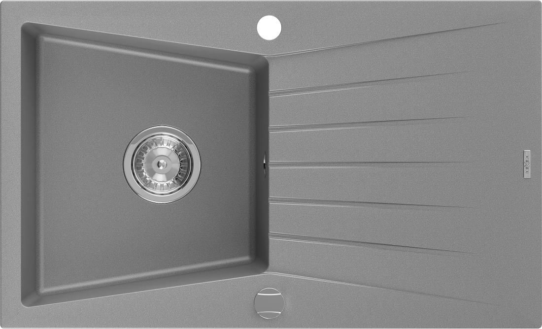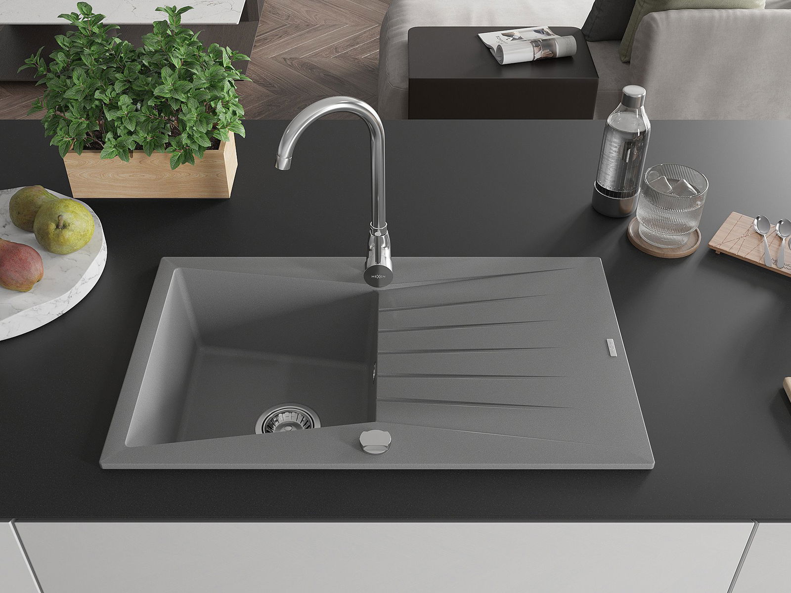 Die Spüle besteht aus hochwertigem Granit. Es ist eine elegante und vor allem praktische Ergänzung zu jeder Küche, unabhängig von ihrem Stil. Hohe Qualität und Granitdauer sorgen für eine langjährige Nutzung.