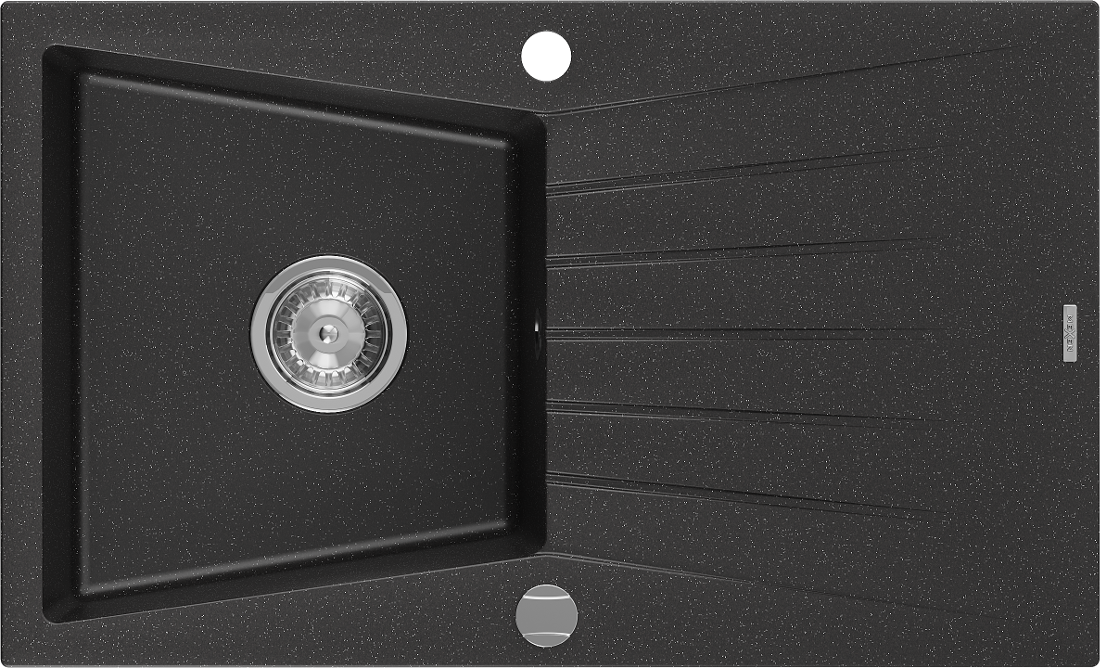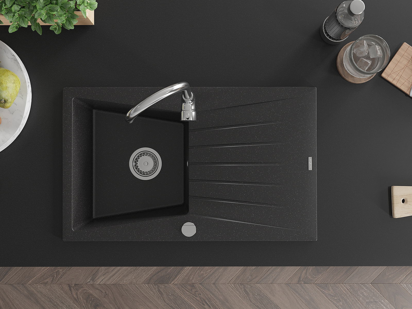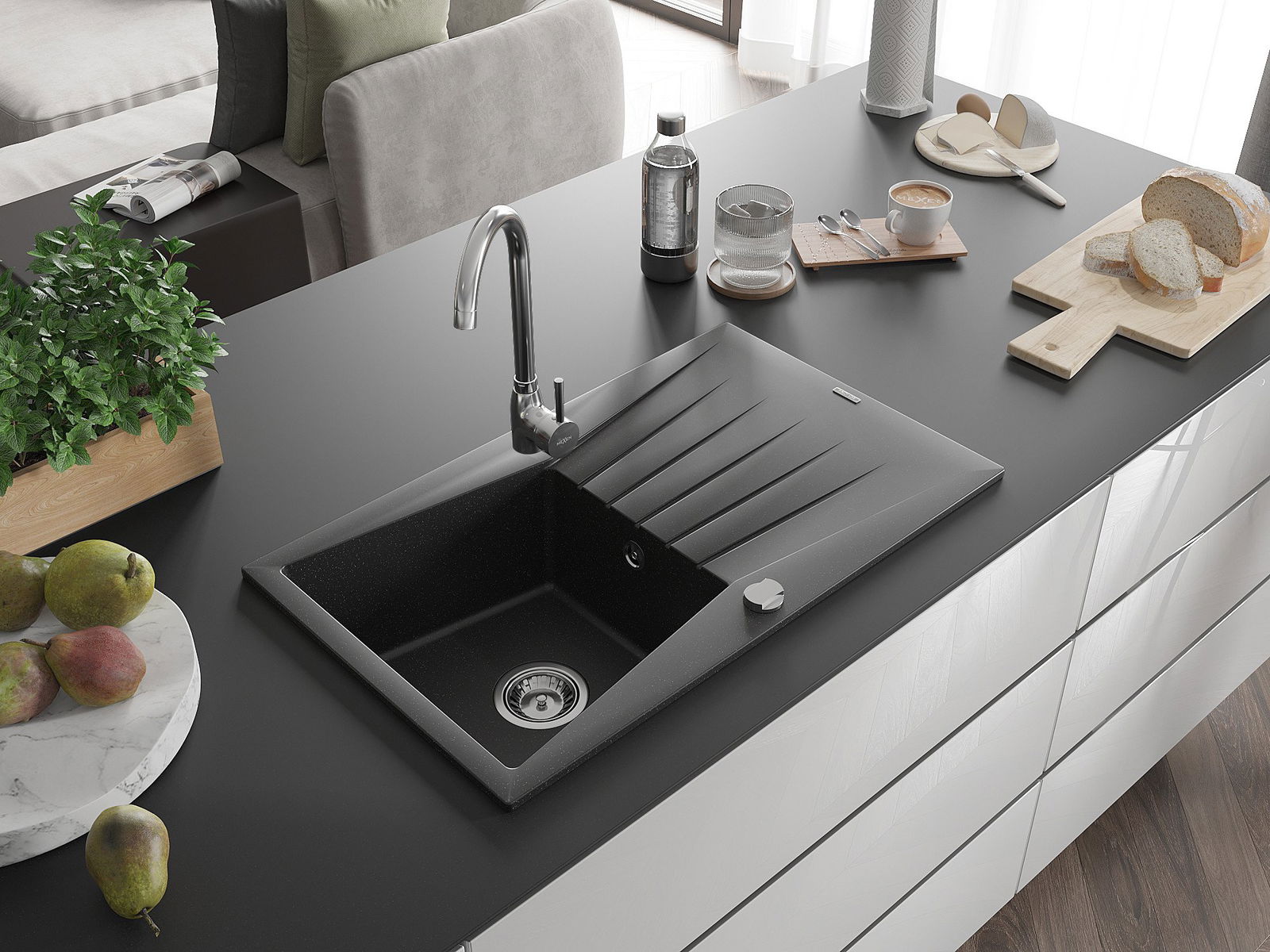 Die Spüle besteht aus hochwertigem Granit. Es ist eine elegante und vor allem praktische Ergänzung zu jeder Küche, unabhängig von ihrem Stil. Hohe Qualität und Granitdauer sorgen für eine langjährige Nutzung.