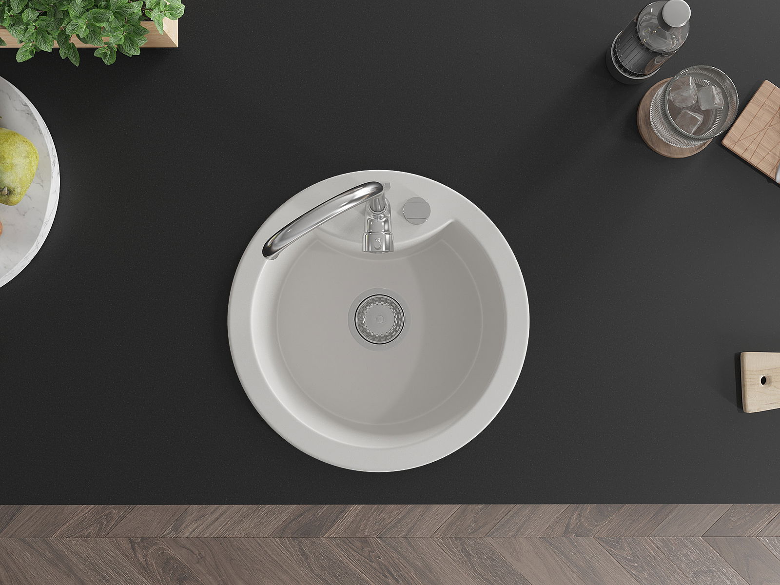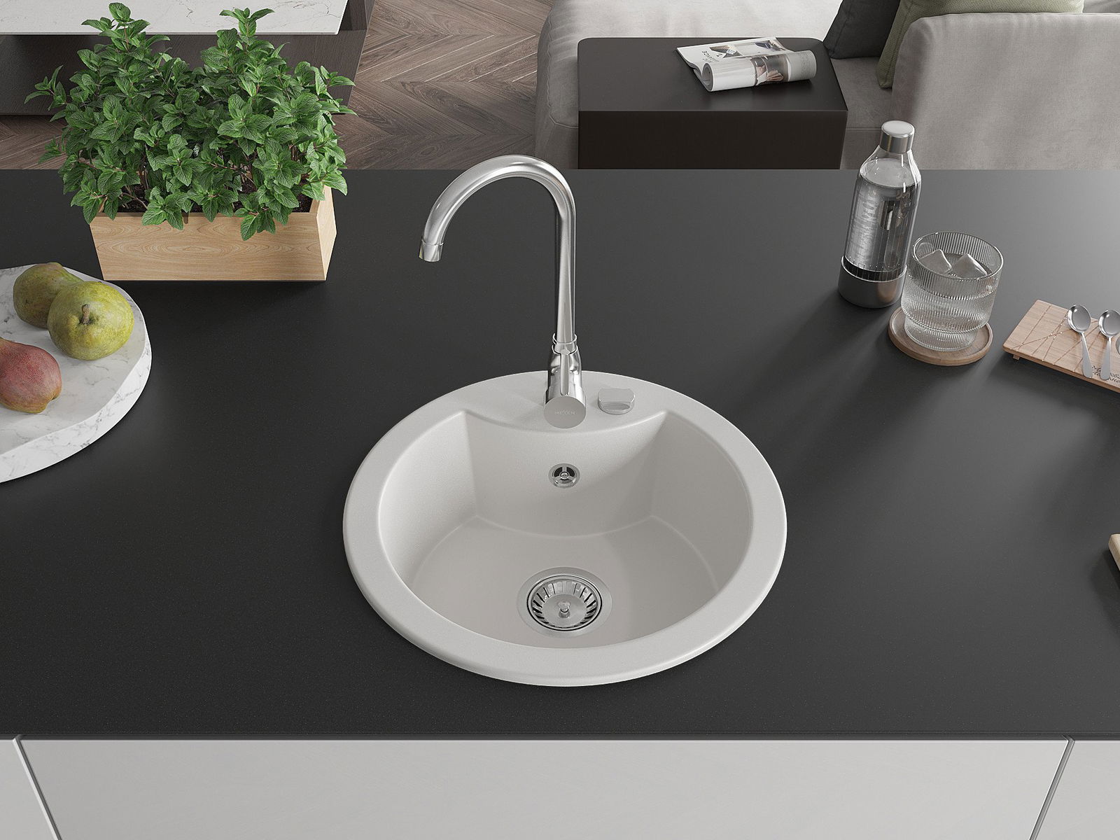 Die Spüle besteht aus hochwertigem Granit. Es ist eine elegante und vor allem praktische Ergänzung zu jeder Küche, unabhängig von ihrem Stil. Hohe Qualität und Granitdauer sorgen für eine langjährige Nutzung.