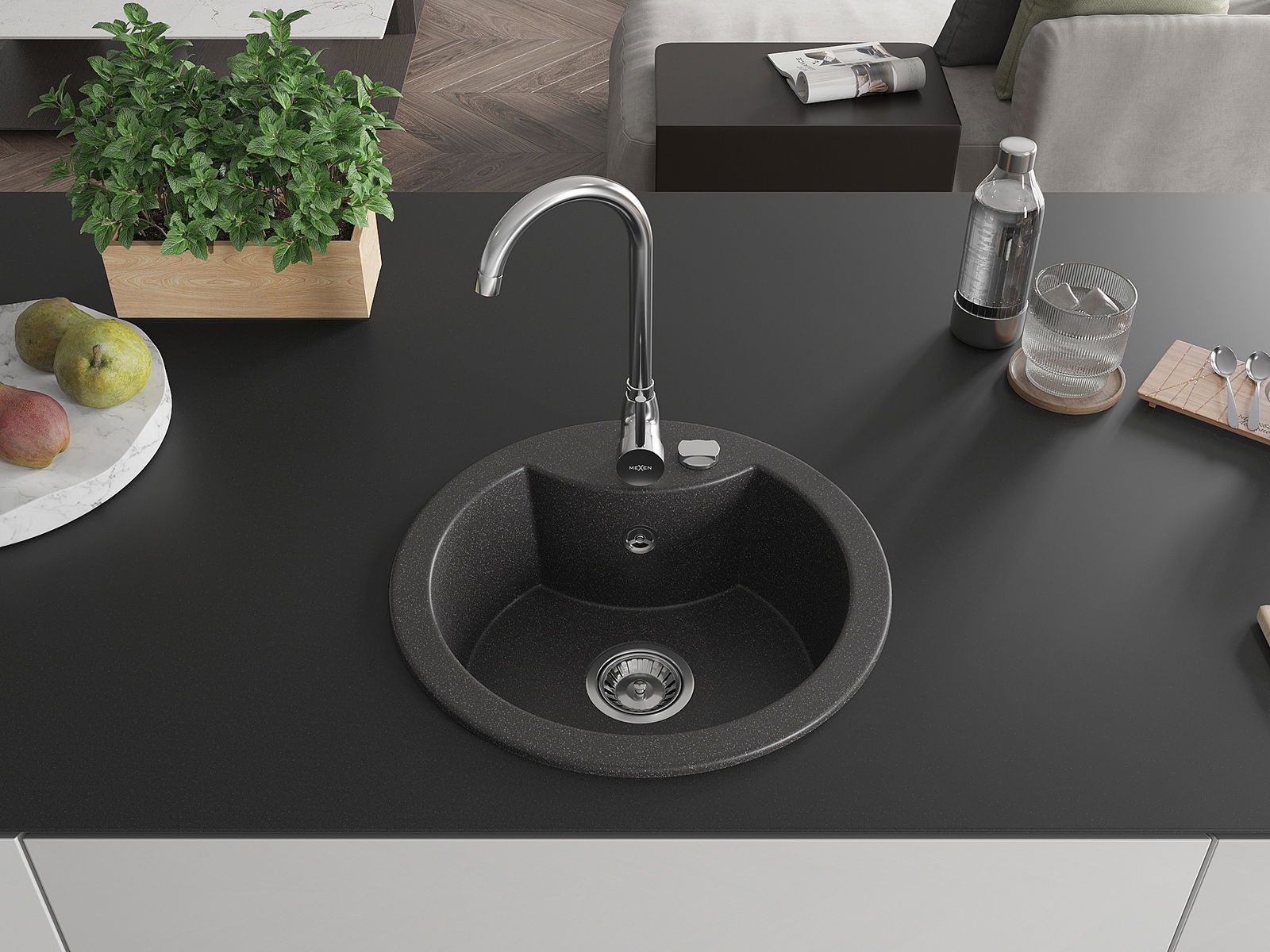 Die Spüle besteht aus hochwertigem Granit. Es ist eine elegante und vor allem praktische Ergänzung zu jeder Küche, unabhängig von ihrem Stil. Hohe Qualität und Granitdauer sorgen für eine langjährige Nutzung.