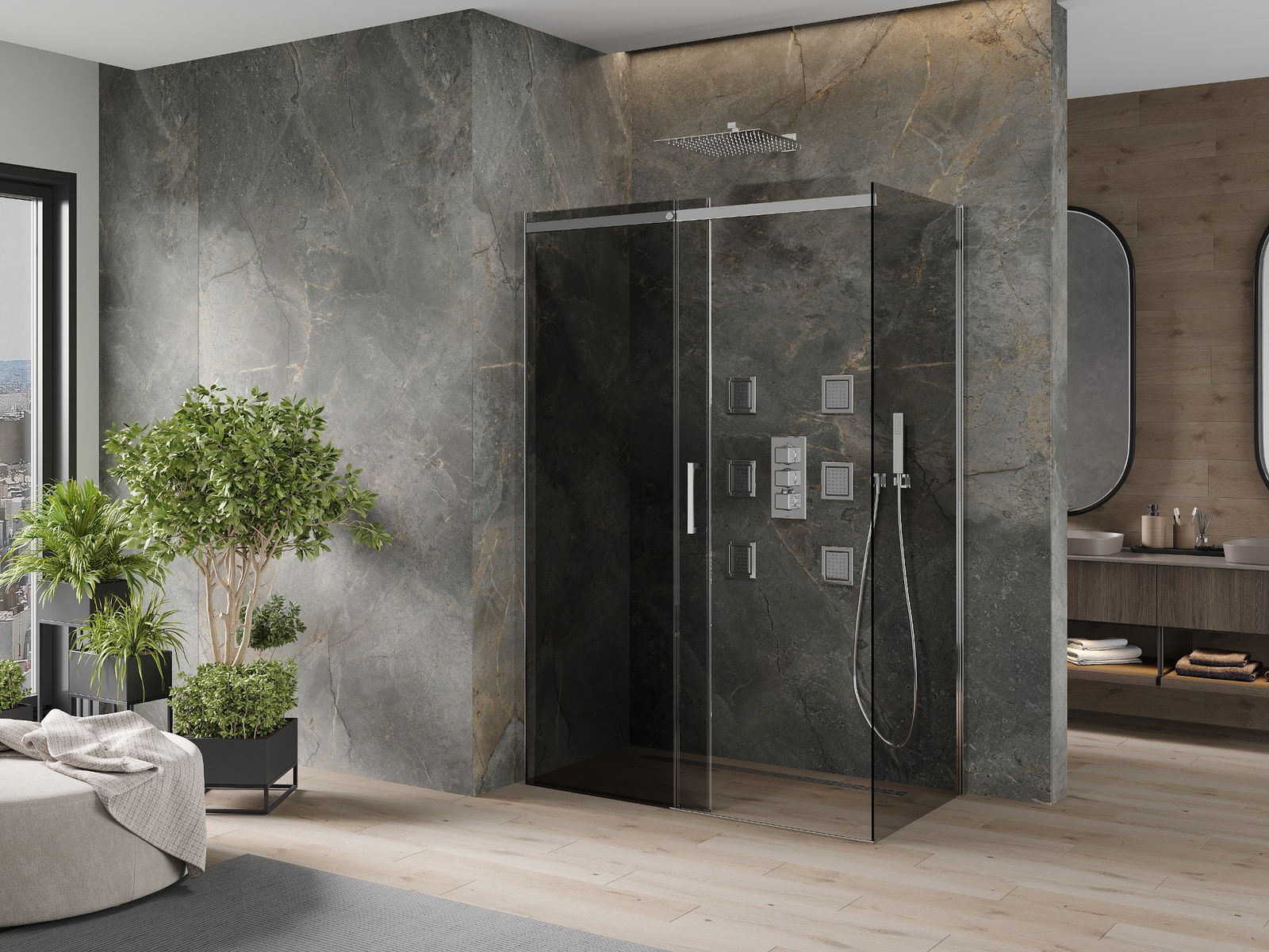 Abhängig von Ihren Bedürfnissen kann das Produkt sowohl auf der Duschschale als auch direkt auf dem Boden montiert werden. Mit der universellen Montagemethode können Sie das Produkt an verschiedene Arten von Badezimmern anpassen und Raum konfigurieren.