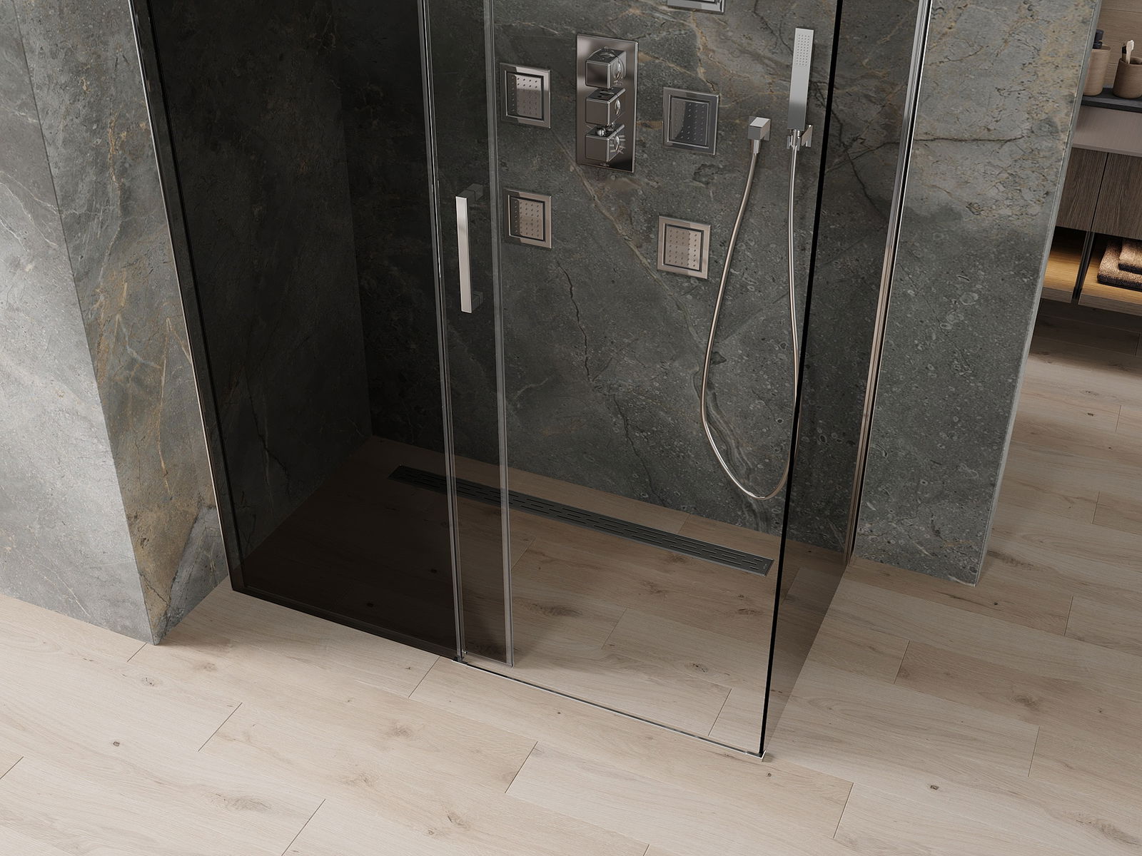 Schiebetüren bewegen sich um spezielle Führer und benötigen keinen zusätzlichen Platz, um sie zu öffnen, sodass sie in kleineren Badezimmern arbeiten. Dank der Doppelwalze mit einem Metallkörper ist ihre Bewegung flüssig.