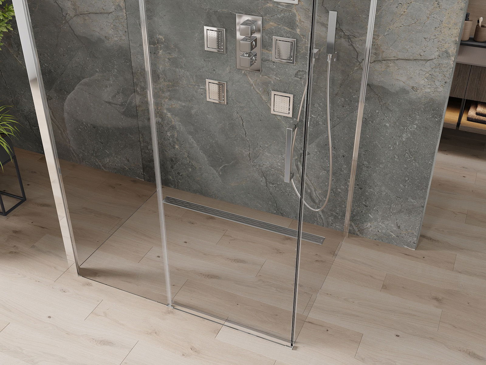 Abhängig von Ihren Bedürfnissen kann das Produkt sowohl auf der Duschschale als auch direkt auf dem Boden montiert werden. Mit der universellen Montagemethode können Sie das Produkt an verschiedene Arten von Badezimmern anpassen und Raum konfigurieren.