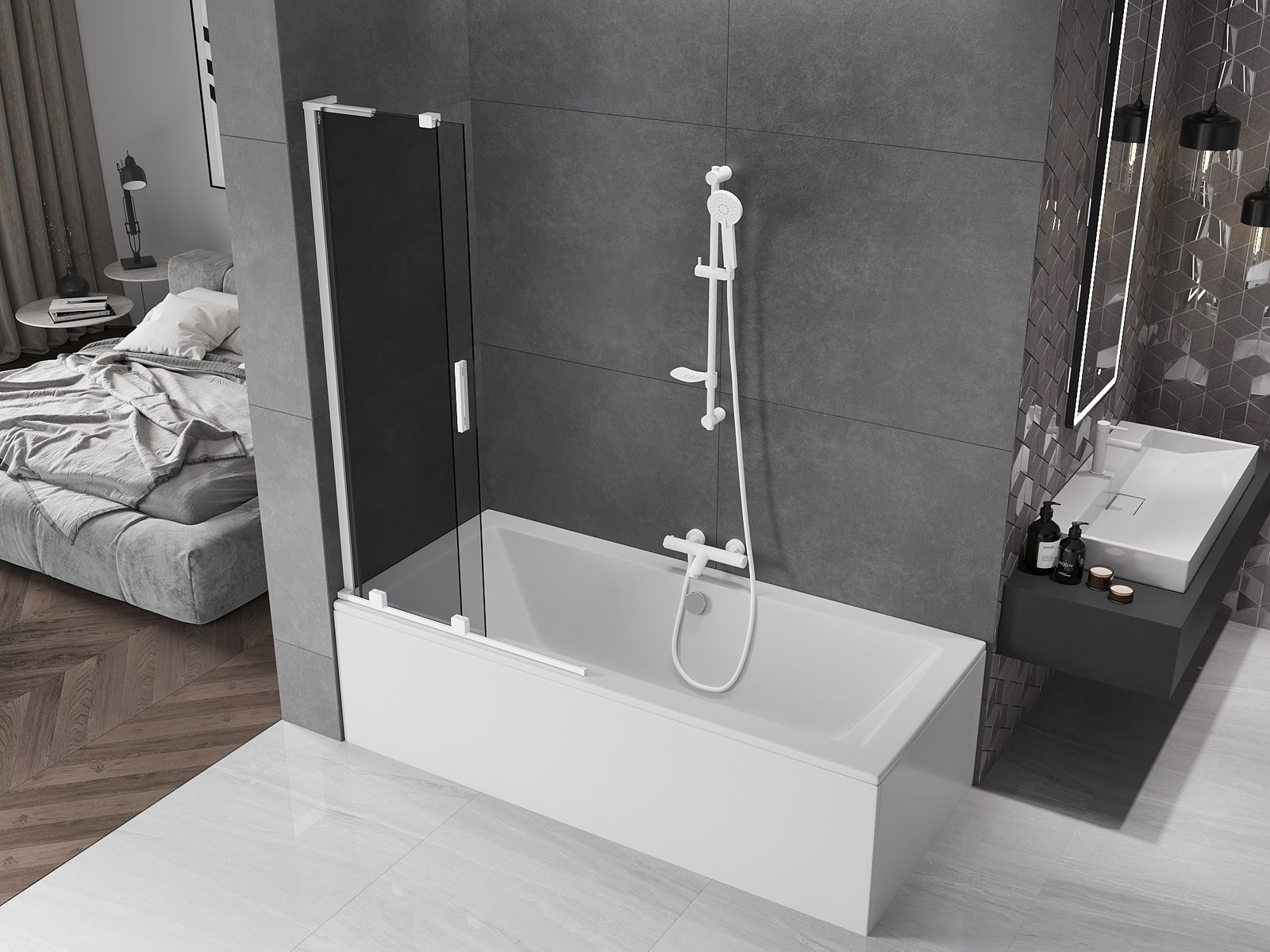 Mexen Velar L Badewannen-Schutzwand 2-flügelig, verschiebbar 95 x 150 cm, Graphit, Weiß - 896-095-003-41-20