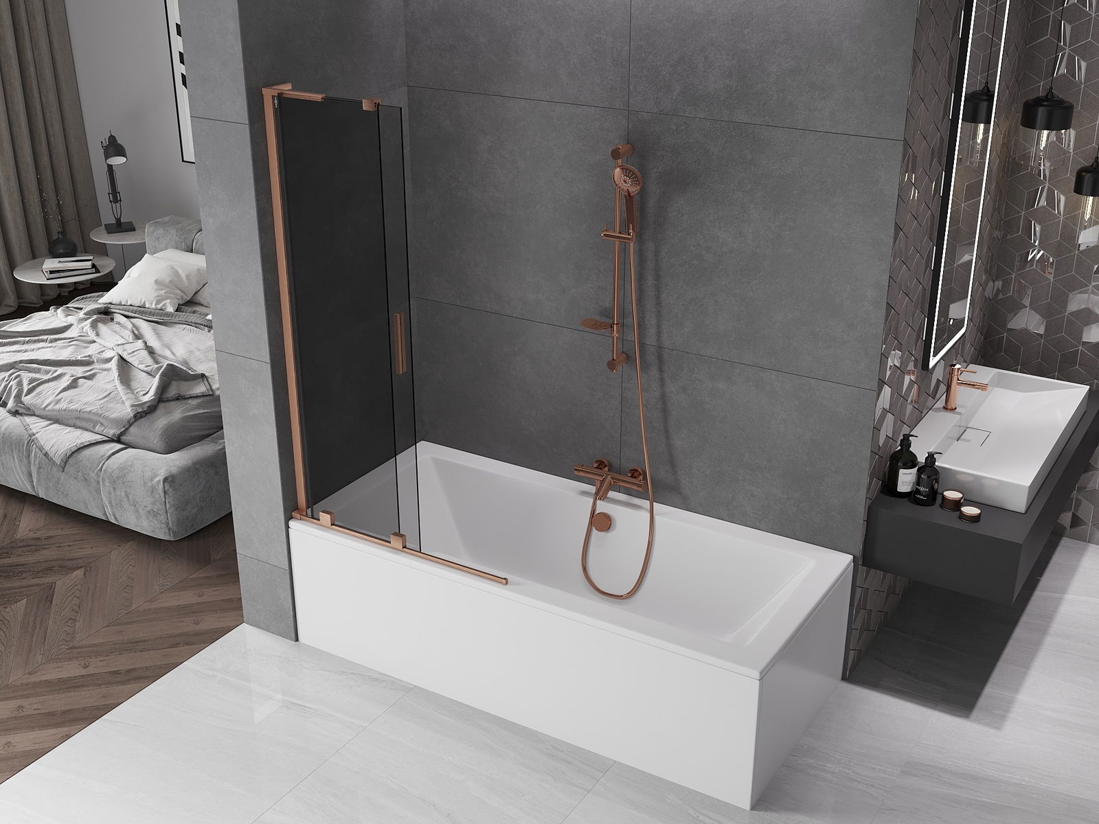 Mexen Velar L Badewannenabtrennung 2-flügelig verschiebbar 95 x 150 cm, Graphit, gebürstetes Kupfer - 896-095-003-41-65