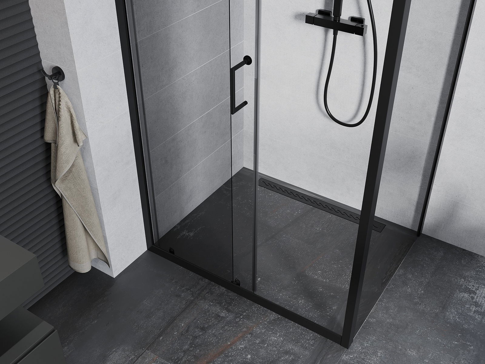 Der praktische und bequeme Griff bestand aus langlebigem und widerstandsfähigem Metall. Die modische Form in Kombination mit einem auf die Farbe der Profile zugeschnittenen Finish verleiht dem Ganzen einen modernen und stilvollen Look und betont die Ästhetik jedes Badezimmers.