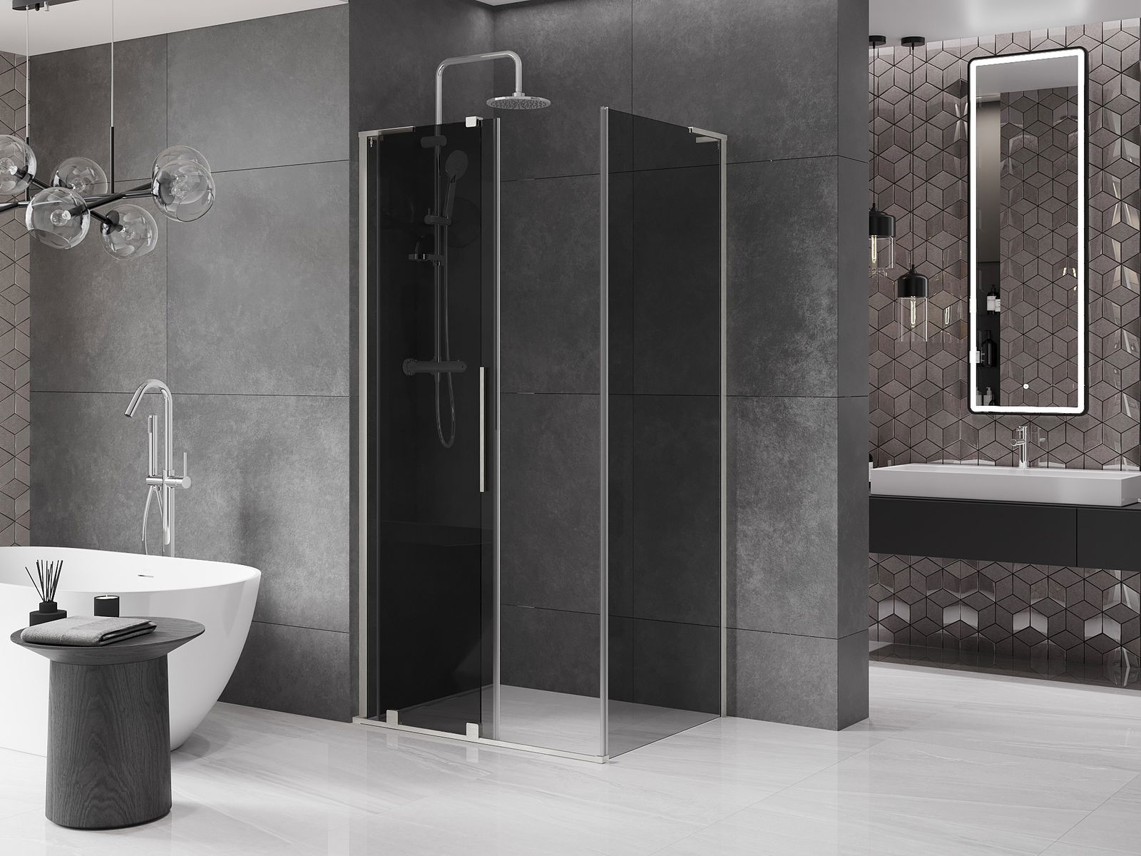Dank der Verwendung eines universellen Montagesystems können die Duschtüren je nach Ihren Bedürfnissen rechts oder links montiert werden. Dank dessen können Sie problemlos eine Dusche entwerfen, die auf den Raum des Badezimmers zugeschnitten ist.