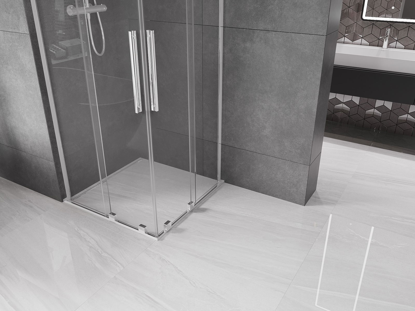 Abhängig von Ihren Bedürfnissen kann das Produkt sowohl auf der Duschschale als auch direkt auf dem Boden montiert werden. Mit der universellen Montagemethode können Sie das Produkt an verschiedene Arten von Badezimmern anpassen und Raum konfigurieren.