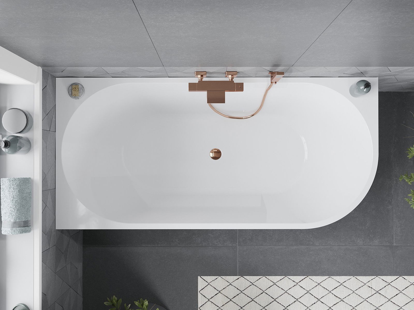 Mexen Mia freistehende Eckbadewanne links 150 x 75 cm, weiß/schwarz, Überlauf Roségold - 52691507575L-60