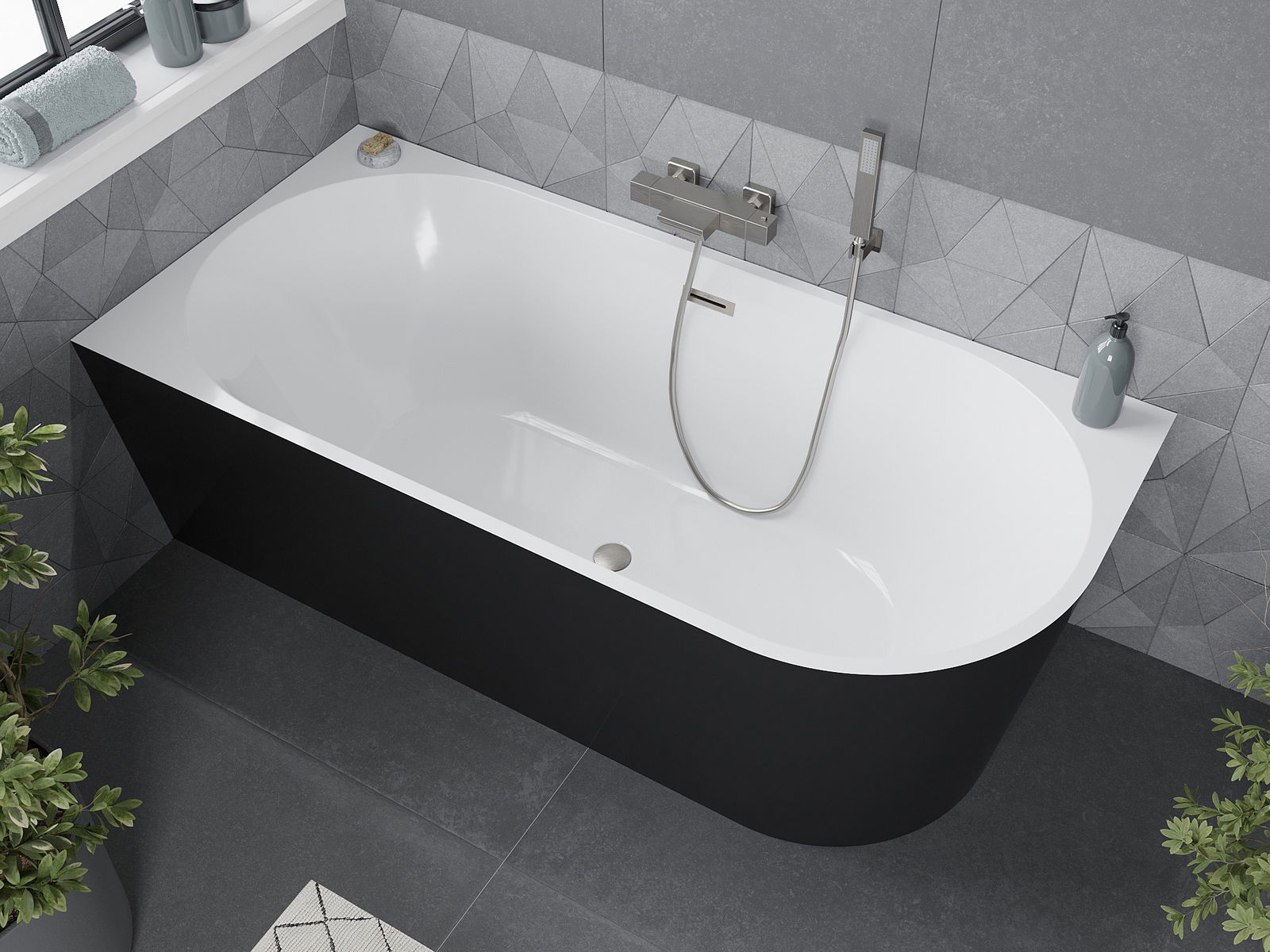 Die Mexen Mia ist eine elegante freistehende Eckbadewanne mit den Maßen 180 x 80 cm, erhältlich in einer attraktiven weiß-schwarzen Farbgebung. Aus Sanitäracryl gefertigt, bietet sie sowohl Langlebigkeit als auch Komfort. Das Finish in gebürstetem Nickel verleiht ein modernes Aussehen. Die Badewanne ist für die Eckmontage konzipiert und bietet eine geräumige Tiefe von 45 cm sowie eine Höhe von 58 cm. Zusätzlich erhöhen die Überlauföffnung und der mittig platzierte Ablauf die Funktionalität des Produkts.