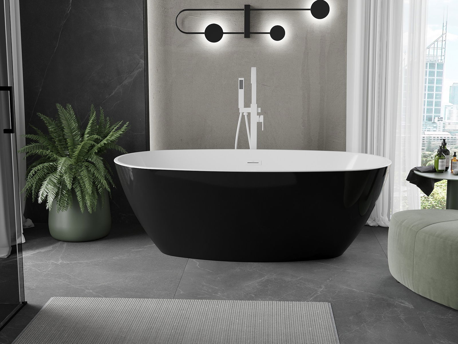 Mexen Eris ist eine elegante, freistehende Badewanne mit den Maßen 170 x 80 cm, ideal für moderne Bäder. Aus Sanitäracryl gefertigt, bietet sie Langlebigkeit und Beständigkeit gegen Mattierung und UV-Strahlen. Ihre ovale Form und glänzende Oberfläche verleihen ihr ein stilvolles Aussehen, während die weiß-schwarze Farbgebung sich hervorragend in verschiedene Arrangements einfügt. Die Wanne ist für die freistehende Montage geeignet und mit einer Überlauföffnung sowie einem Siphon mit Klick-Klack-Verschluss ausgestattet, was den Nutzungskomfort erhöht.