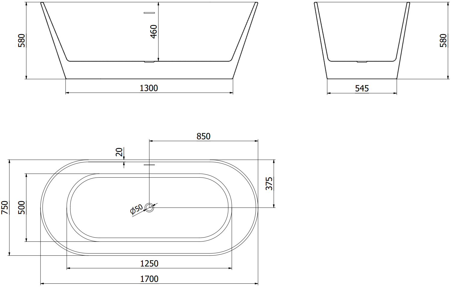 Mexen Flavia freistehende Badewanne 170 x 75 cm, weiß/schwarz, Überlauf gebürstetes Nickel - 54031708075-97