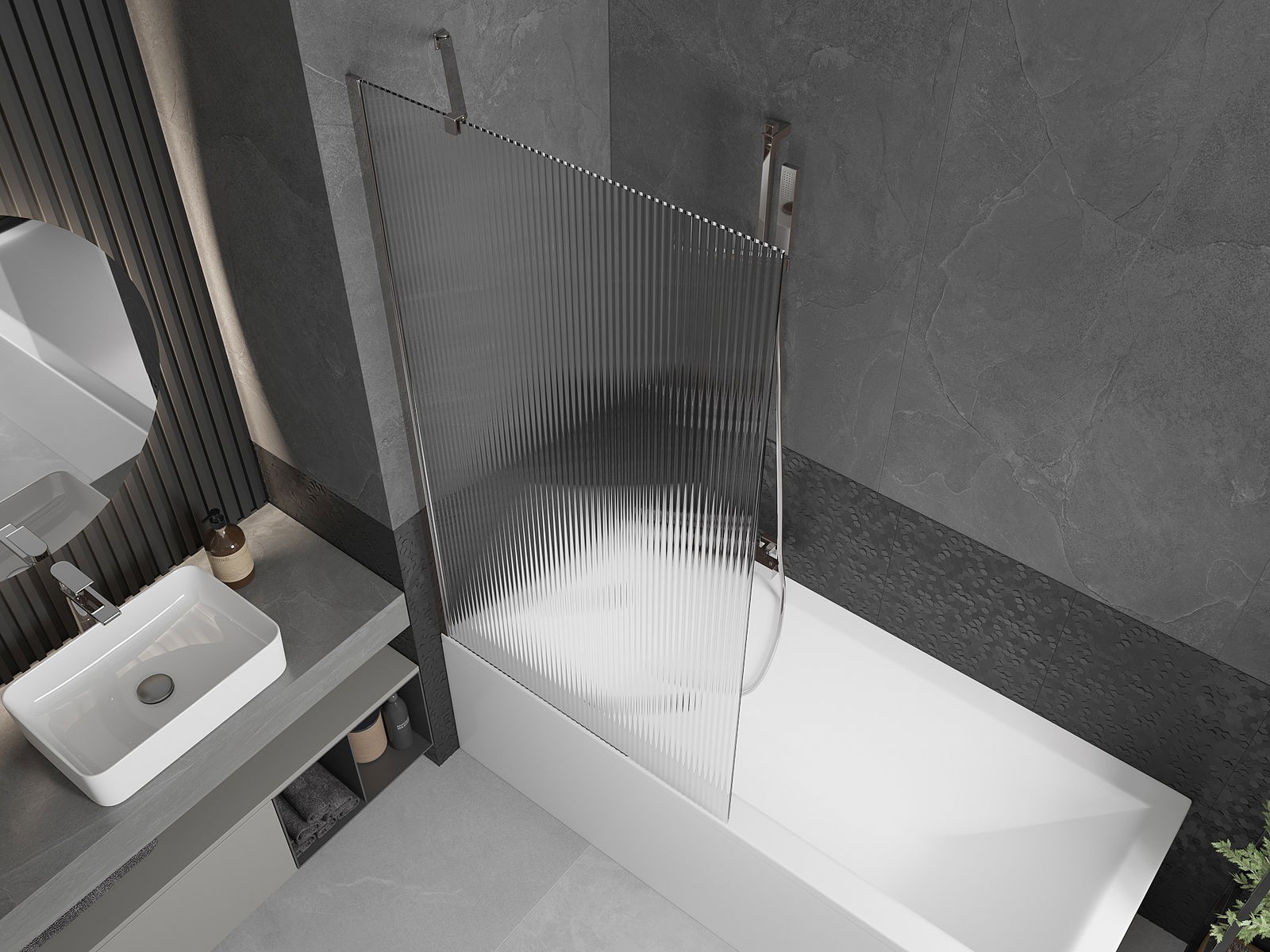 Effektiver Schutz gegen Wasser beim Baden. Der Bildschirm hat Dichtungen, die sich perfekt an das Glas des Glass und an der Badewanne der Badewanne anpassen. Eine funktionale Lösung, um Sicherheit und einfache Wartung zu gewährleisten.