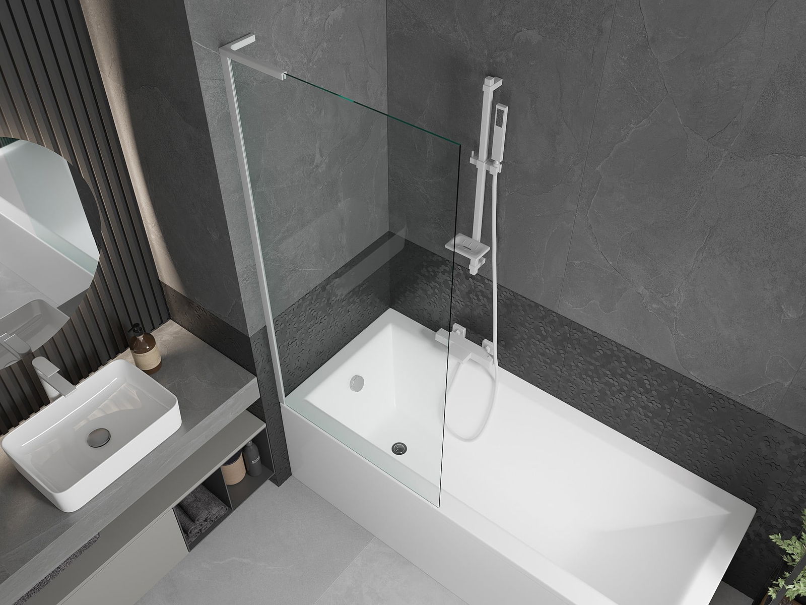 Effektiver Schutz vor dem Überlaufen von Wasser während des Badens. Die Duschwand verfügt über Dichtungen, die sich perfekt an die Glasscheibe und den Rand der Badewanne anpassen. Eine funktionale Lösung, die Sicherheit und einfache Reinigung gewährleistet.