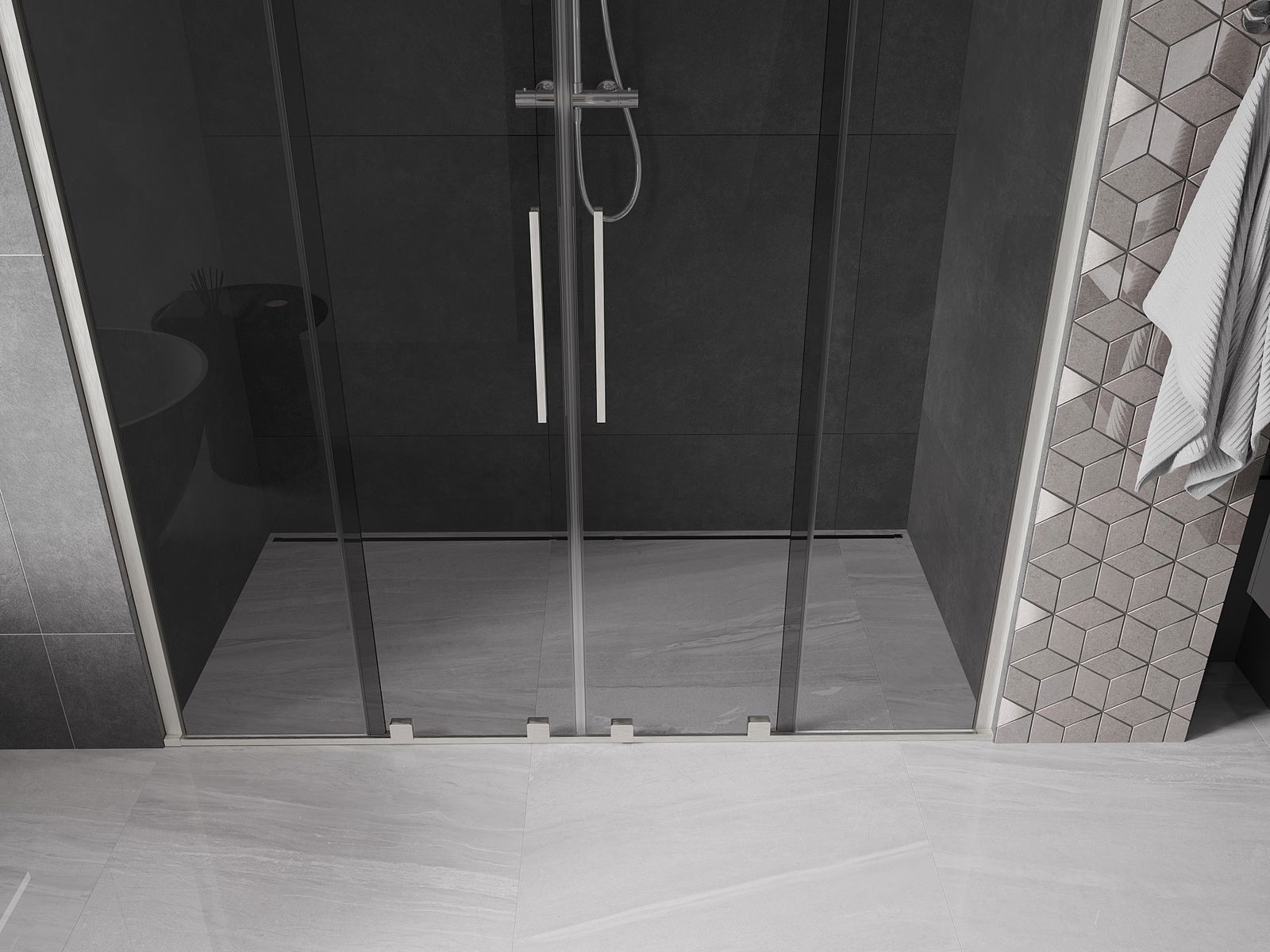 Der praktische und bequeme Griff ist aus rostfreiem Stahl gefertigt. Die modische Form, kombiniert mit einer auf die Farbe der Profile abgestimmten Oberfläche, verleiht dem Ganzen ein modernes und stilvolles Aussehen, das die Ästhetik eines jeden Badezimmers aufwertet.