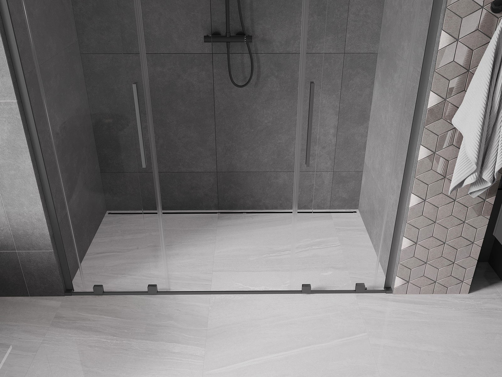 Der praktische und bequeme Griff ist aus rostfreiem Stahl gefertigt. Die modische Form, kombiniert mit einer auf die Farbe der Profile abgestimmten Oberfläche, verleiht dem Ganzen ein modernes und stilvolles Aussehen, das die Ästhetik eines jeden Badezimmers aufwertet.