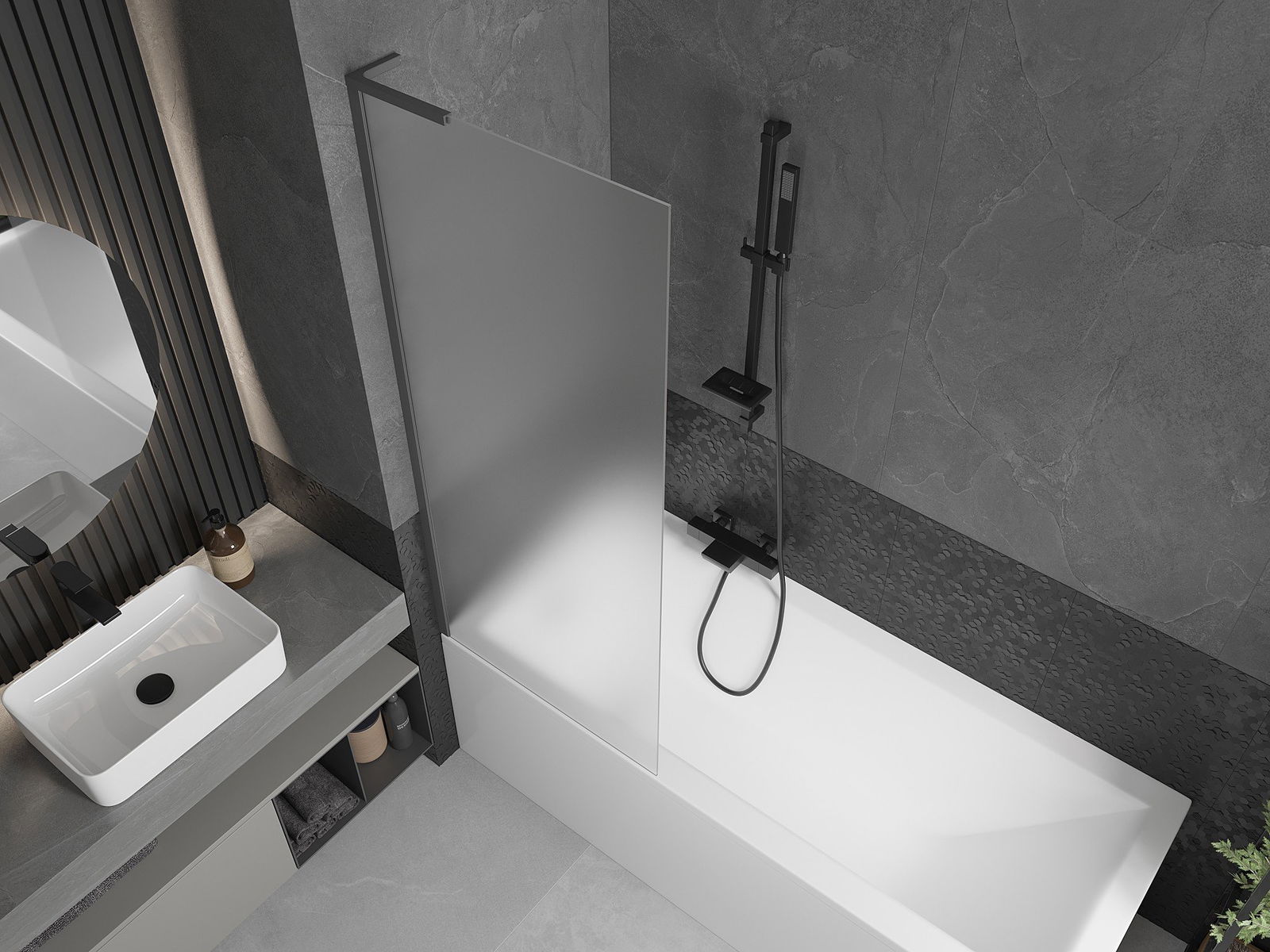 Effektiver Schutz gegen Wasser beim Baden. Der Bildschirm hat Dichtungen, die sich perfekt an das Glas des Glass und an der Badewanne der Badewanne anpassen. Eine funktionale Lösung, um Sicherheit und einfache Wartung zu gewährleisten.