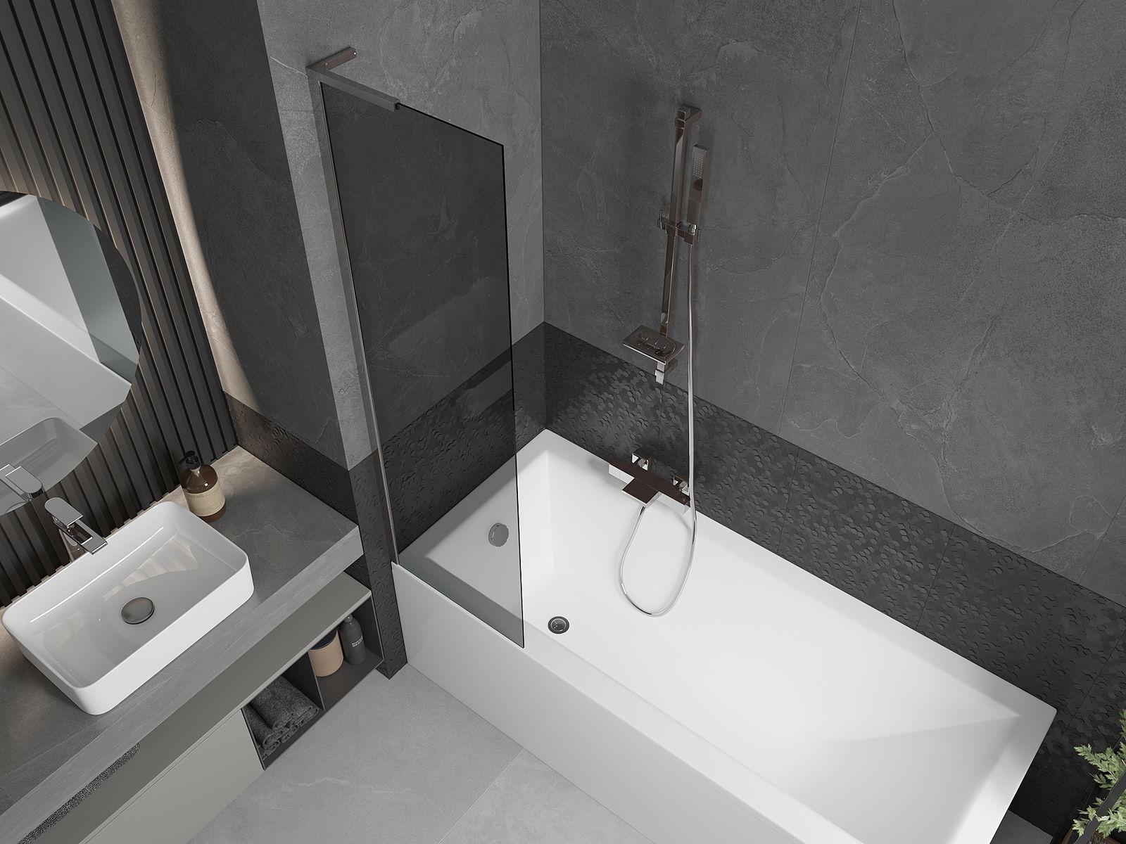 Effektiver Schutz gegen Wasser beim Baden. Der Bildschirm hat Dichtungen, die sich perfekt an das Glas des Glass und an der Badewanne der Badewanne anpassen. Eine funktionale Lösung, um Sicherheit und einfache Wartung zu gewährleisten.